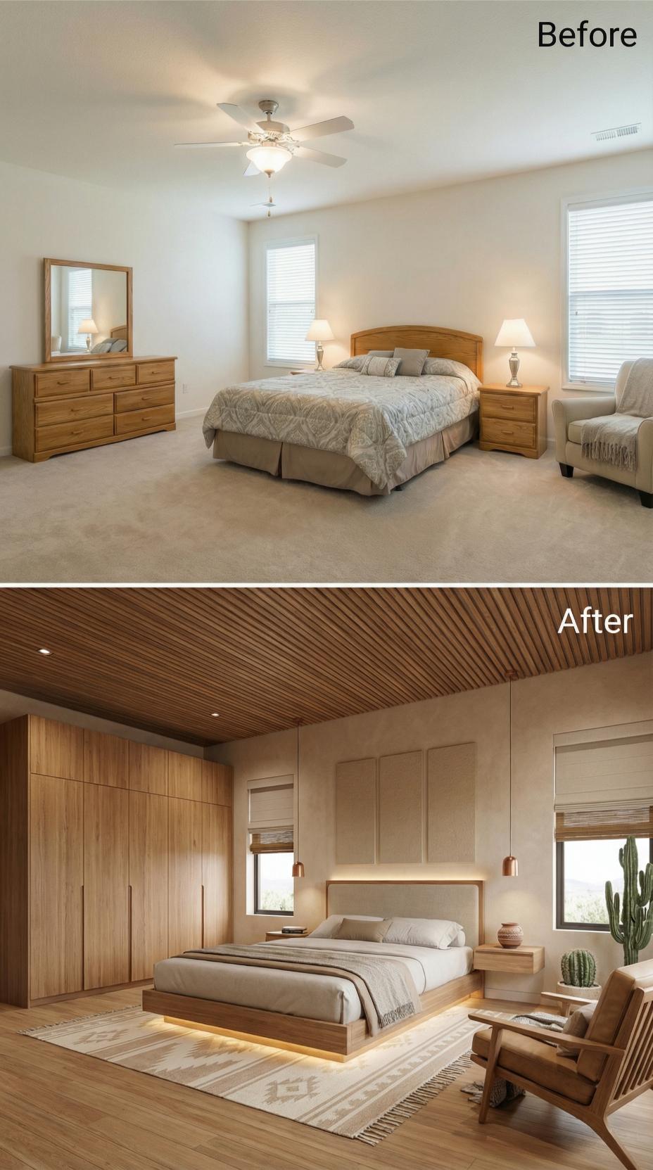 Natural wood transforms this formerly sterile builder-grade bedroom into a soothing retreat perfect for calming anxious minds. Rich wooden slat ceilings replace the basic white surface, while built-in wardrobes eliminate clutter that triggers stress. The floating platform bed creates clean lines and under-lighting adds gentle ambiance. Warm pendant lights and natural textures ground the space in comfort.