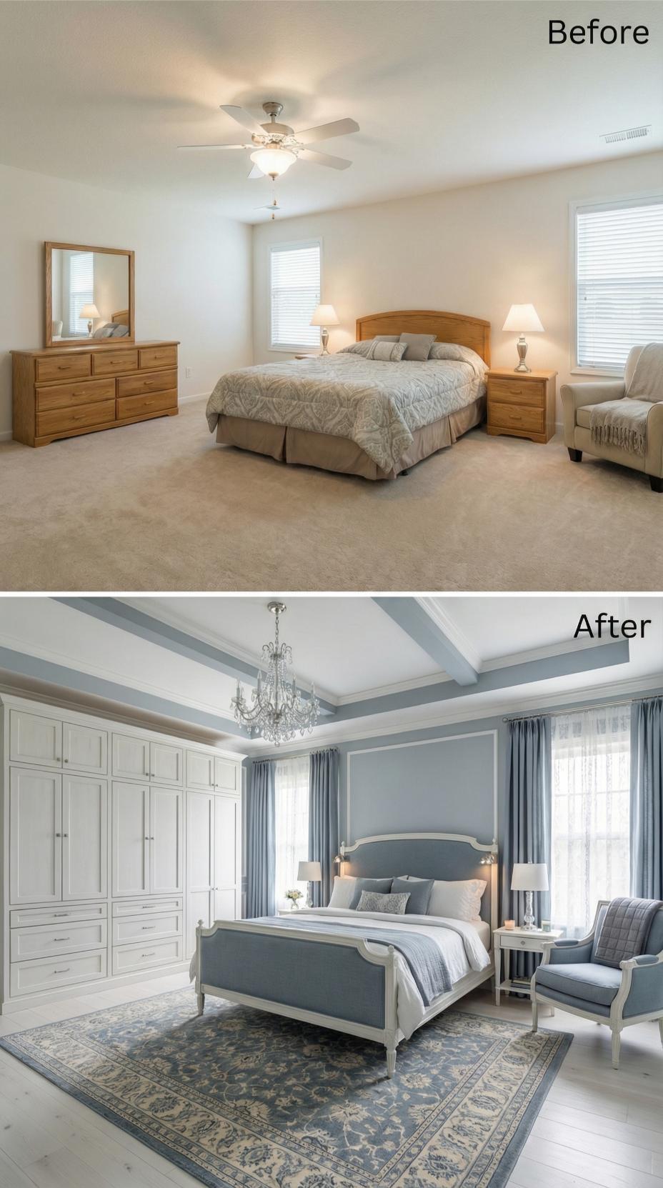 Sophisticated blue and white palette elevates this formerly basic builder-grade bedroom into a calming retreat perfect for anxious minds. Custom built-in wardrobes replace mismatched furniture while elegant crown molding and coffered ceiling details add architectural interest. A crystal chandelier replaces the standard ceiling fan, complementing the refined upholstered bed frame and coordinating armchair that invite peaceful relaxation.