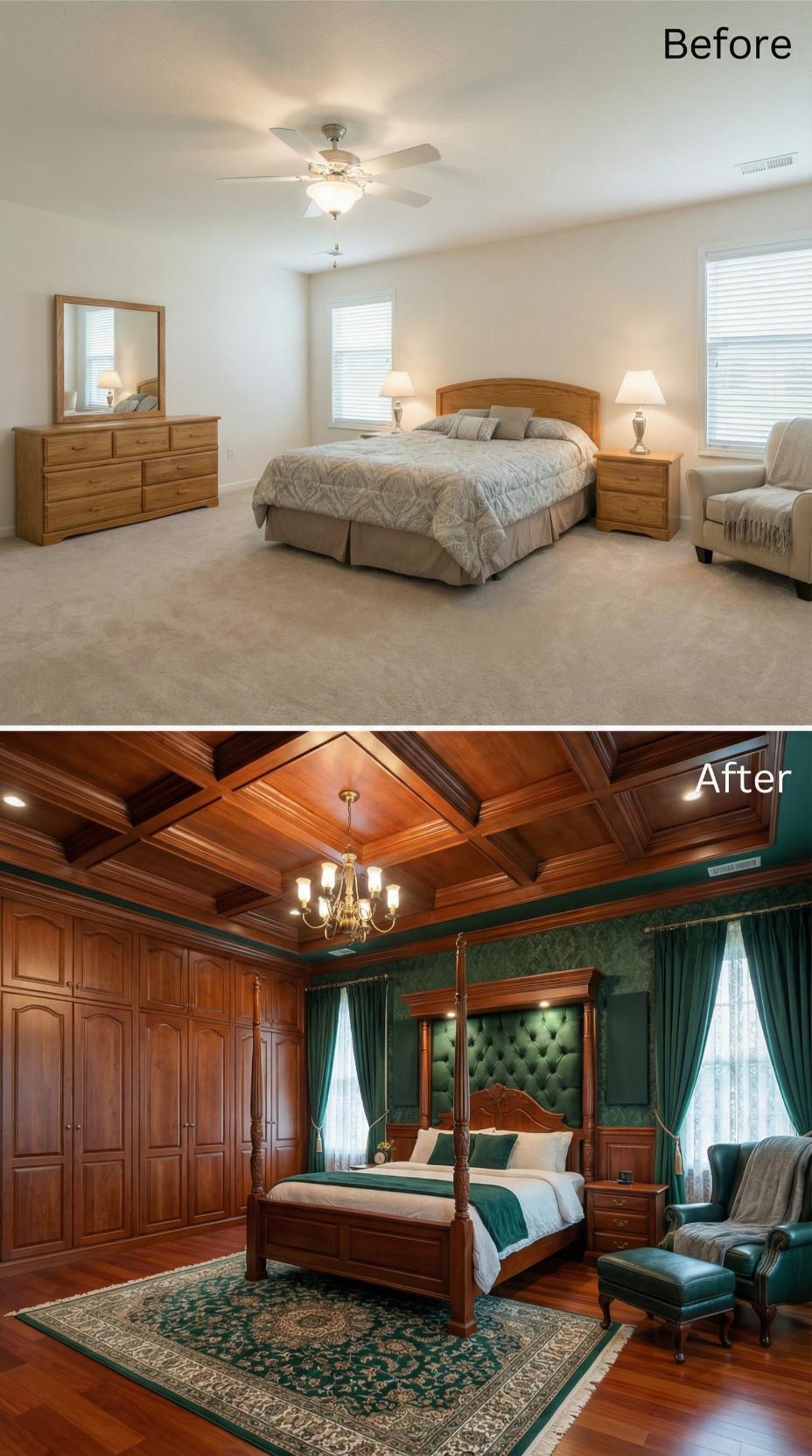 Rich mahogany paneling transforms this builder-grade bedroom for anxious people into a sophisticated sanctuary with coffered ceilings and built-in wardrobes. Deep emerald wallpaper and luxurious drapery replace plain walls, while an elegant chandelier elevates the simple ceiling fan. The four-poster bed anchors the space with commanding presence, complemented by a traditional Persian rug that adds warmth to polished hardwood floors.