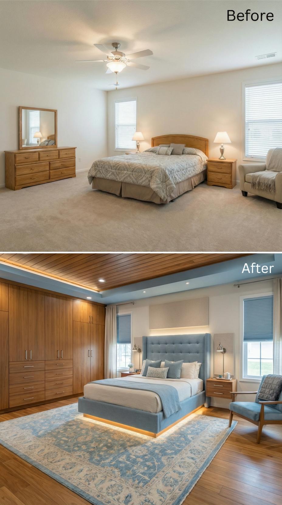 Warm wood cabinetry replaces scattered furniture while a sophisticated tufted headboard creates the focal point this builder-grade bedroom for anxious people desperately needed. Rich hardwood floors ground the space with natural texture, complemented by a stunning wood-slat ceiling detail that adds architectural interest. Strategic under-bed lighting and recessed fixtures eliminate harsh shadows, while the cohesive blue and wood palette promotes the serene atmosphere essential for restful sleep.