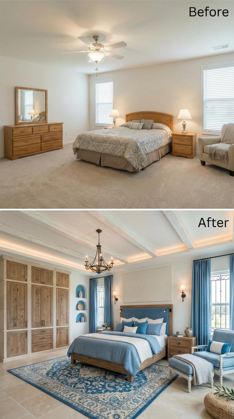 Exposed white-washed beams and a stunning chandelier replace the cramped ceiling fan that dominated this builder-grade bedroom for anxious people. Custom built-in storage eliminates clutter while ocean-inspired blues in the upholstered headboard, patterned rug, and flowing curtains create a calming retreat. Under-bed lighting and layered textiles complete the transformation from sterile space to serene sanctuary.