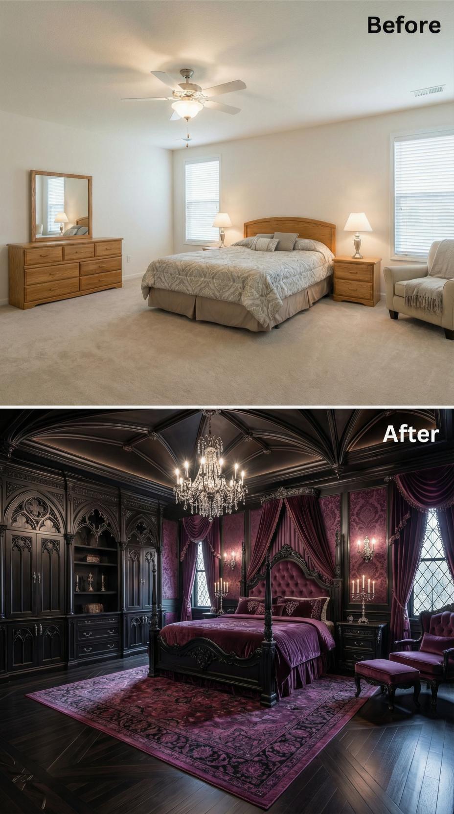 Rich burgundy velvet and ornate Gothic architecture completely reimagine this once-bland builder-grade bedroom for anxious people. Dark wooden panels with intricate carved details replace simple drywall, while a crystal chandelier and matching sconces create dramatic ambient lighting. The luxurious four-poster bed draped in deep purple fabrics offers a cocoon-like retreat, transforming sterile beige carpeting and basic oak furniture into an opulent medieval-inspired sanctuary.