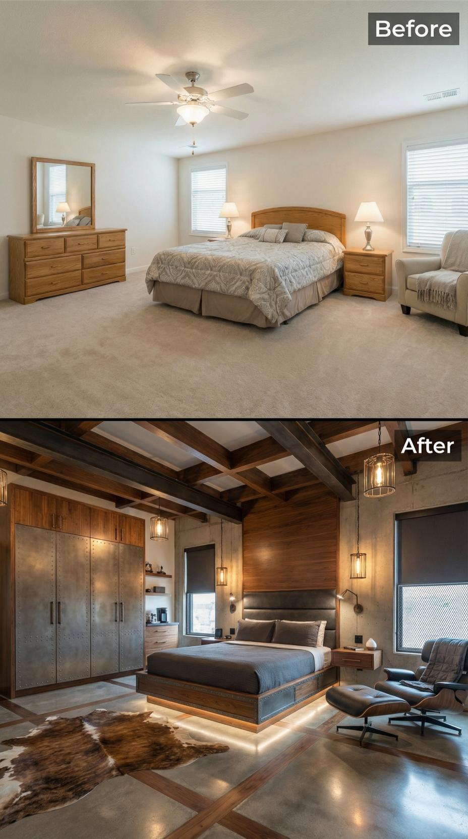Exposed wooden beams and metal accents transform this bland builder-grade bedroom into a sophisticated industrial retreat. Custom built-in wardrobes with metal detailing replace basic furniture, while pendant lighting and rich textures create dramatic ambiance. The floating platform bed anchored by a leather accent wall establishes a striking focal point that completely reimagines the space’s potential.