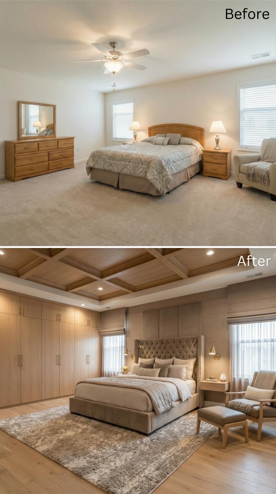 Sophisticated coffered ceiling details immediately elevate this space from its builder-grade bedroom origins, while floor-to-ceiling built-in wardrobes maximize storage and create architectural interest. Rich wood tones unify the custom millwork, and pendant lighting flanks an upholstered headboard for focused task lighting. Hardwood floors anchor the luxury transformation, complemented by layered rugs and refined neutral textiles that promote restful sleep.