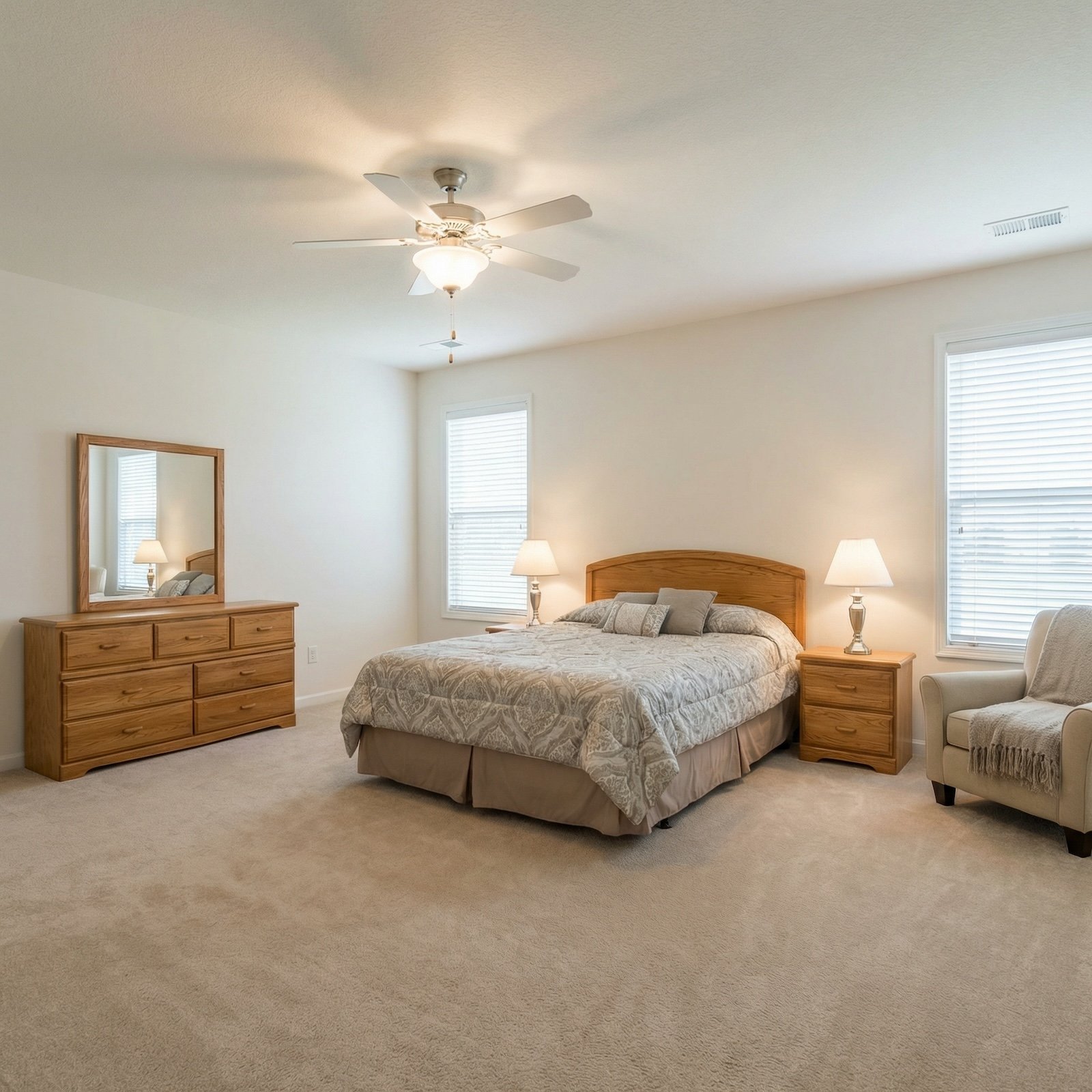 Warm lavender walls replace stark white surfaces, creating an instantly calming atmosphere for restless minds. Built-in wardrobes maximize storage while eliminating visual clutter that can trigger anxiety. The tufted headboard and brass chandelier add sophisticated touches, while flowing curtains soften harsh window lines. Rich hardwood floors ground the space with natural warmth, transforming this builder-grade bedroom into a serene retreat.