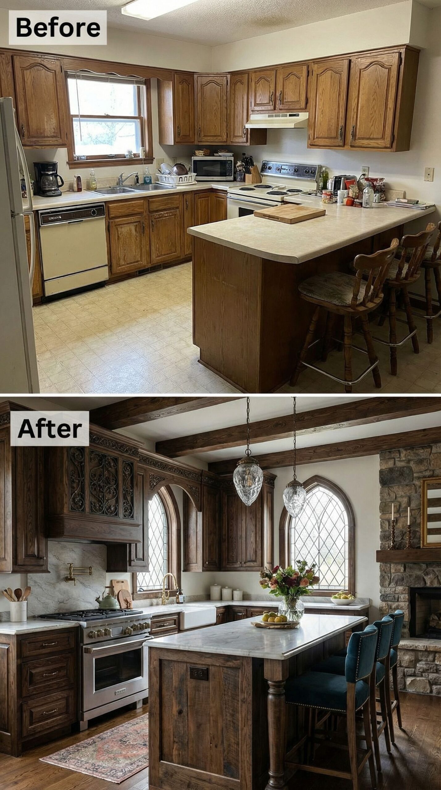 Oak cabinets transform from plain suburban style into ornate Gothic masterpieces with intricate carved details and decorative metalwork. Arched leaded glass windows replace standard rectangular ones, while exposed wooden ceiling beams and stone fireplace surround create authentic medieval atmosphere. Marble countertops, crystal pendant lights, and navy velvet bar stools complete this dramatic rustic Gothic transformation.