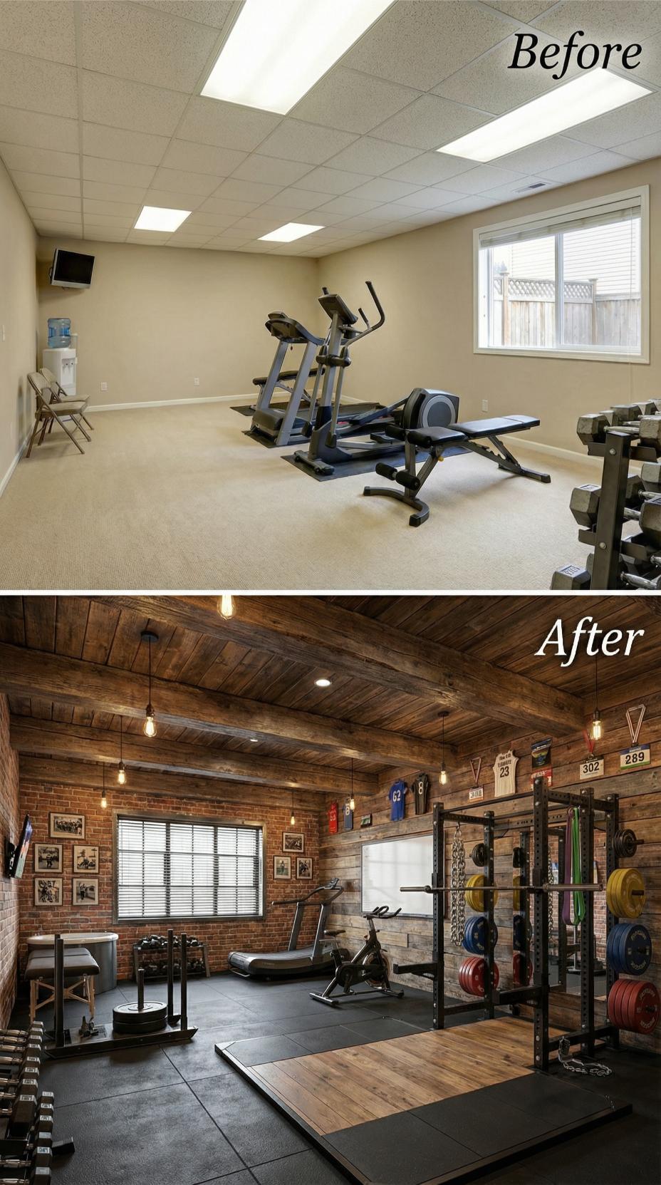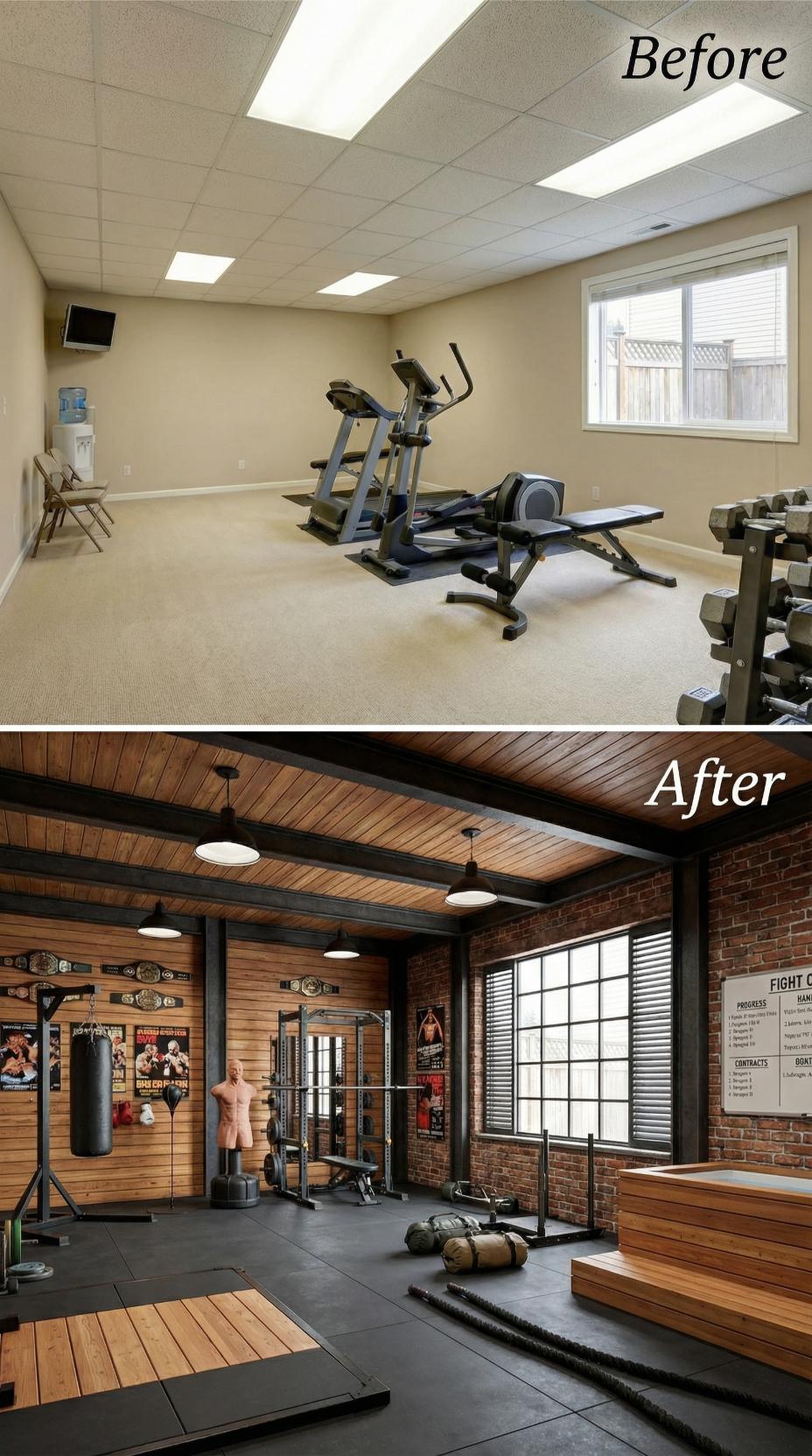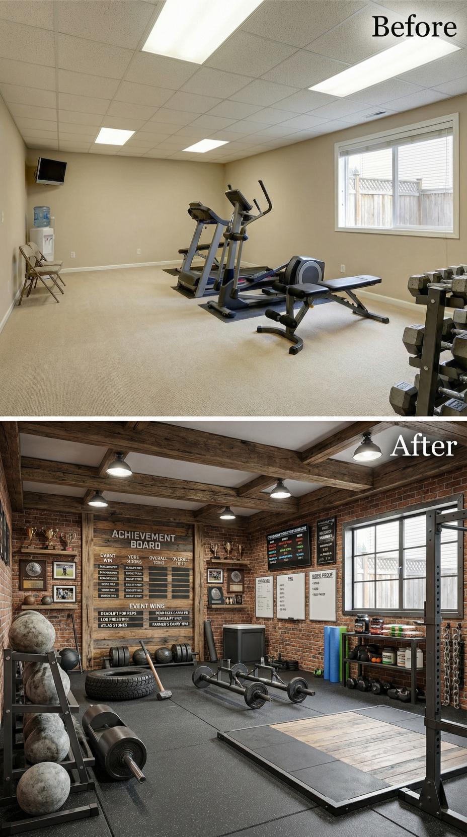 Exposed brick walls and rustic wooden ceiling beams transform this builder-grade home gym into a serious training facility. The renovation replaces sterile beige walls and drop ceiling tiles with raw industrial elements that inspire peak performance. Achievement boards, strategic lighting, and organized equipment storage create a motivational atmosphere where competitive athletes can push their limits and track their progress effectively.