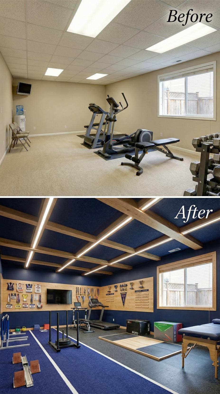 Dramatic navy walls replace bland beige surfaces while custom wooden ceiling beams with integrated LED strips create an inspiring athletic atmosphere. The transformation adds a striking trophy display wall, professional-grade flooring with court markings, and strategic equipment placement that turns a builder-grade home gym into a motivational training facility. Bold color blocking and championship memorabilia fuel competitive spirit during every workout session.
