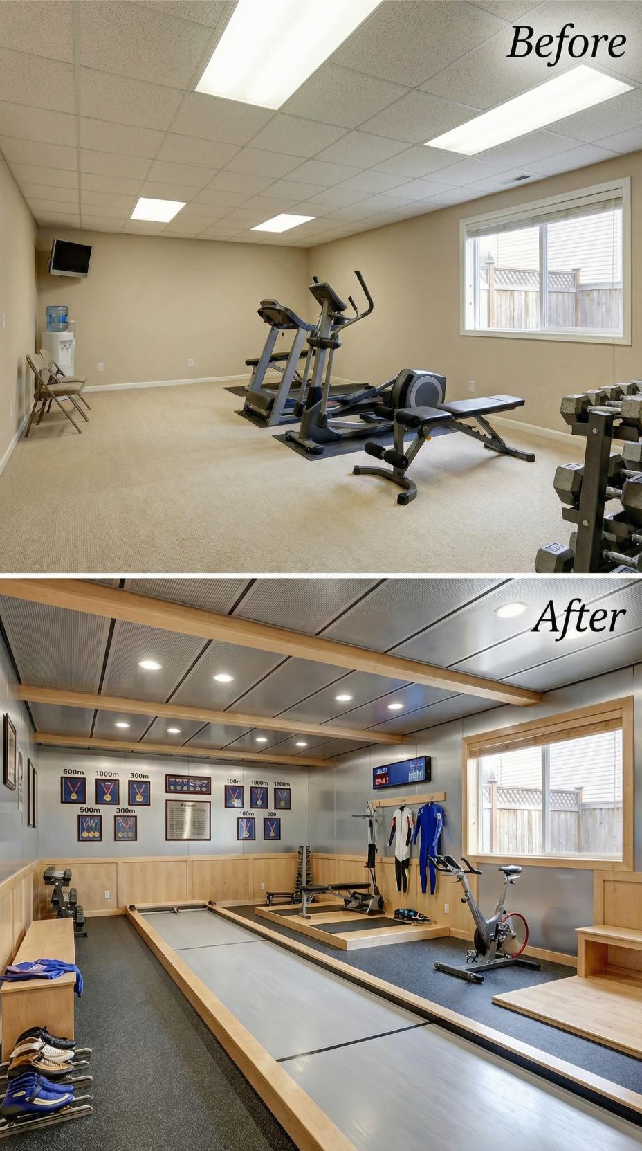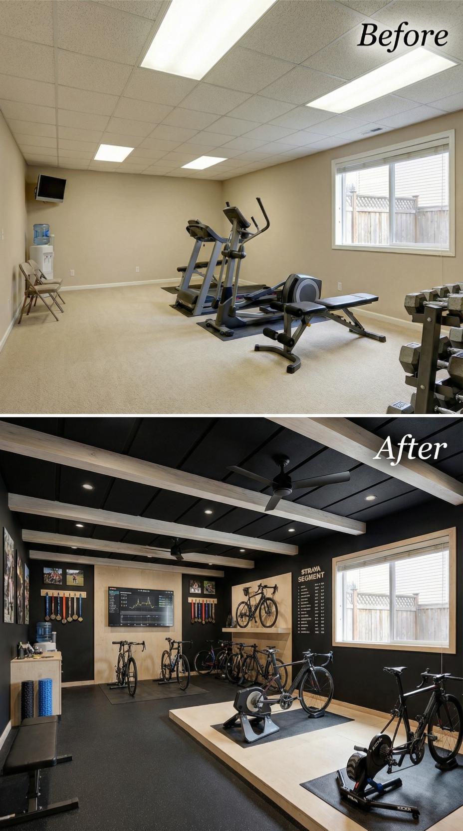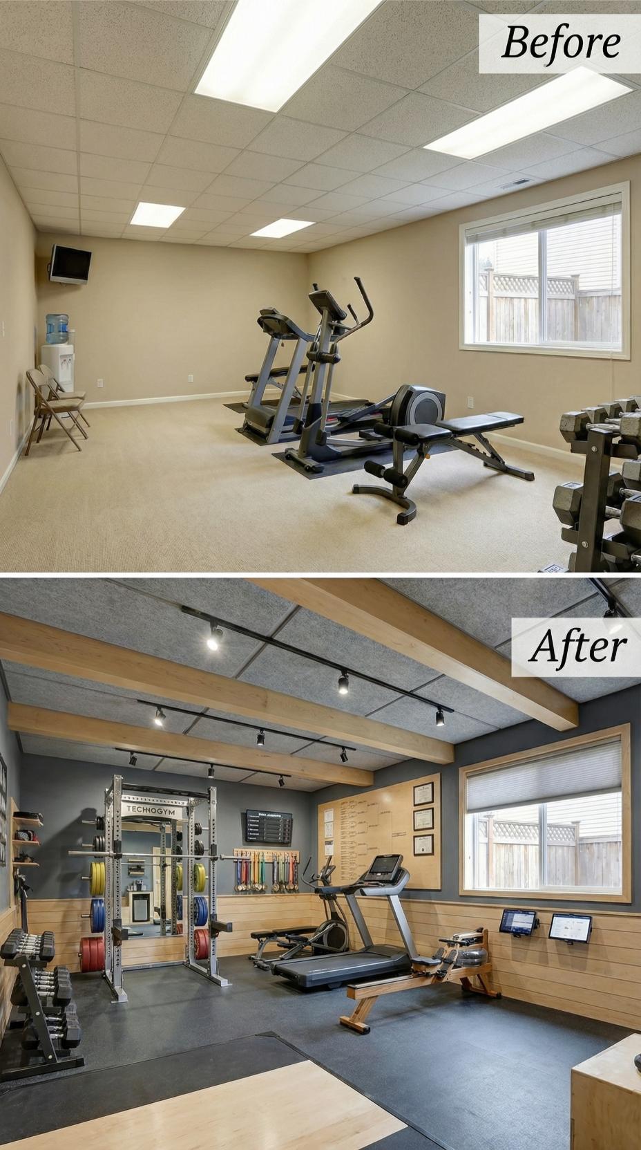 Exposed wooden beams and dramatic track lighting completely transformed this builder-grade home gym into a professional training facility. Dark charcoal walls create striking contrast against natural wood paneling, while specialized rubber flooring replaces bland carpet. Strategic equipment organization maximizes functionality, turning a cramped basement workout space into an inspiring athletic environment that motivates serious fitness enthusiasts.