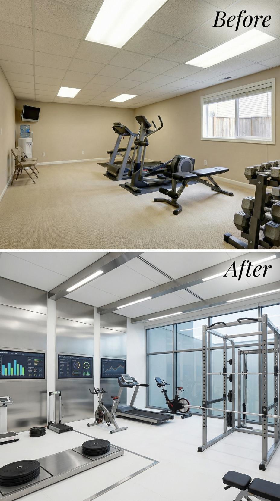 Professional-grade equipment transforms this once-basic carpeted basement into a sleek athletic performance hub. Digital displays showcase workout metrics along pristine white walls, while modern cardio machines and a robust power rack replace the builder-grade setup. Strategic lighting and clean lines create an inspiring environment where serious athletes can push their limits and track their progress with precision.