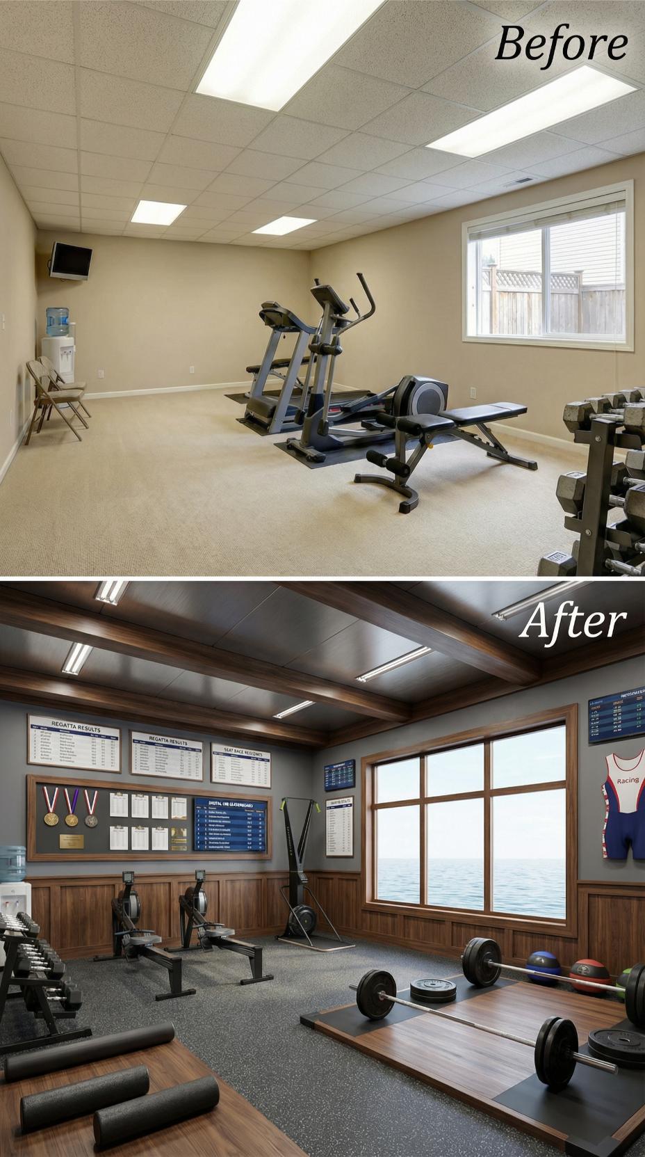 Wood-paneled wainscoting and exposed beam ceilings create an upscale rowing club atmosphere that transforms a bland builder-grade home gym into a championship-worthy training facility. Strategic placement of regatta medals, performance charts, and team memorabilia motivates athletes while rowing machines face panoramic water views through enlarged windows. Rich hardwood flooring grounds free weights and Olympic equipment in sophisticated style.