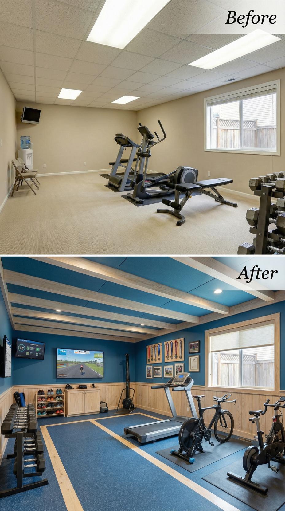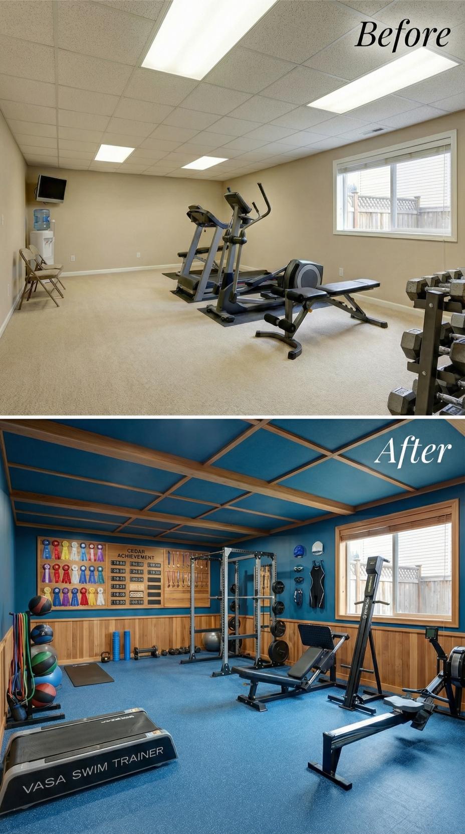Vibrant blue walls and matching flooring completely transform this formerly bland workout space into an energizing fitness sanctuary. Wood wainscoting adds warmth while the geometric wood beam ceiling treatment creates architectural interest overhead. Organized wall storage displays equipment and achievement charts, while professional-grade machines occupy the open floor plan. Strategic lighting and colorful exercise balls inject personality into what was once a forgettable beige room.