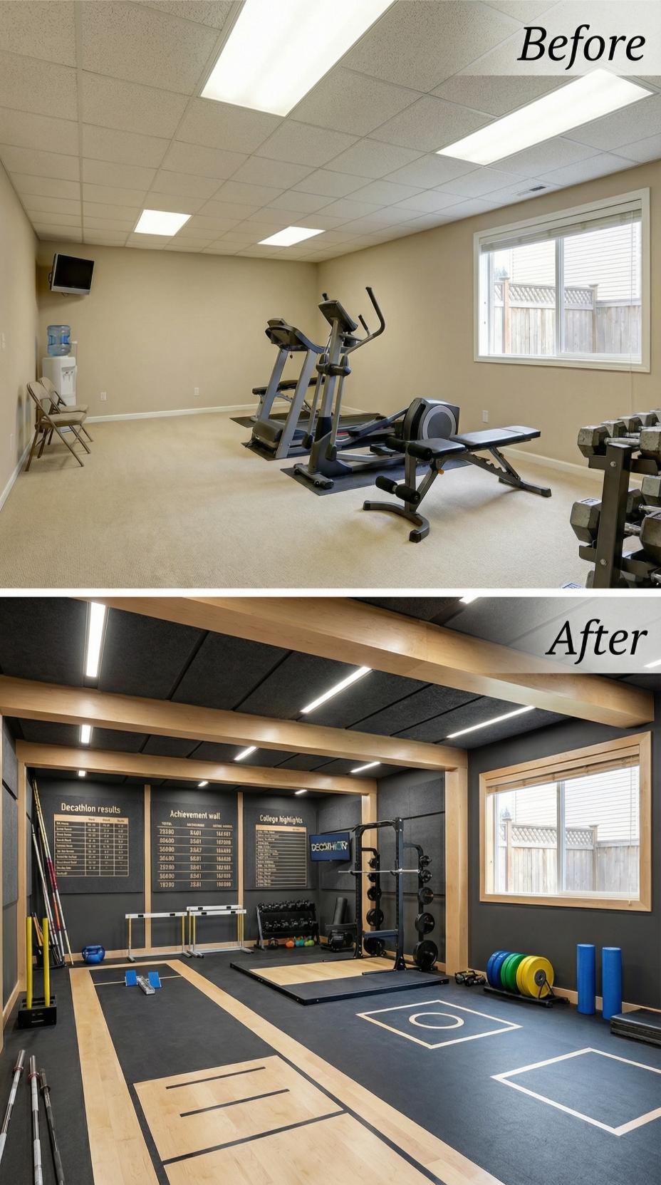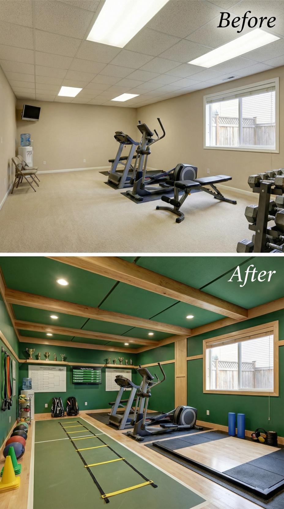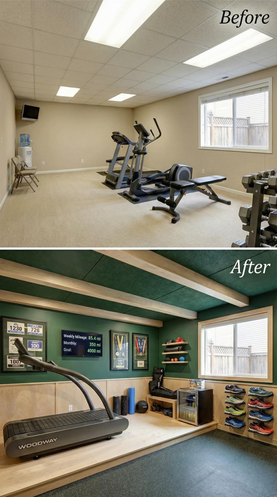 Exposed wooden beams and rich emerald walls transform this formerly bland builder-grade home gym into an inspiring athletic sanctuary. The renovation replaces generic beige surfaces with dynamic green paint, organized shoe storage, and motivational tracking displays. Wood wainscoting adds warmth while ceiling beams create architectural interest overhead. Strategic shelving accommodates sports equipment and personal achievements, turning a sterile workout space into a personalized fitness retreat that celebrates athletic accomplishments.