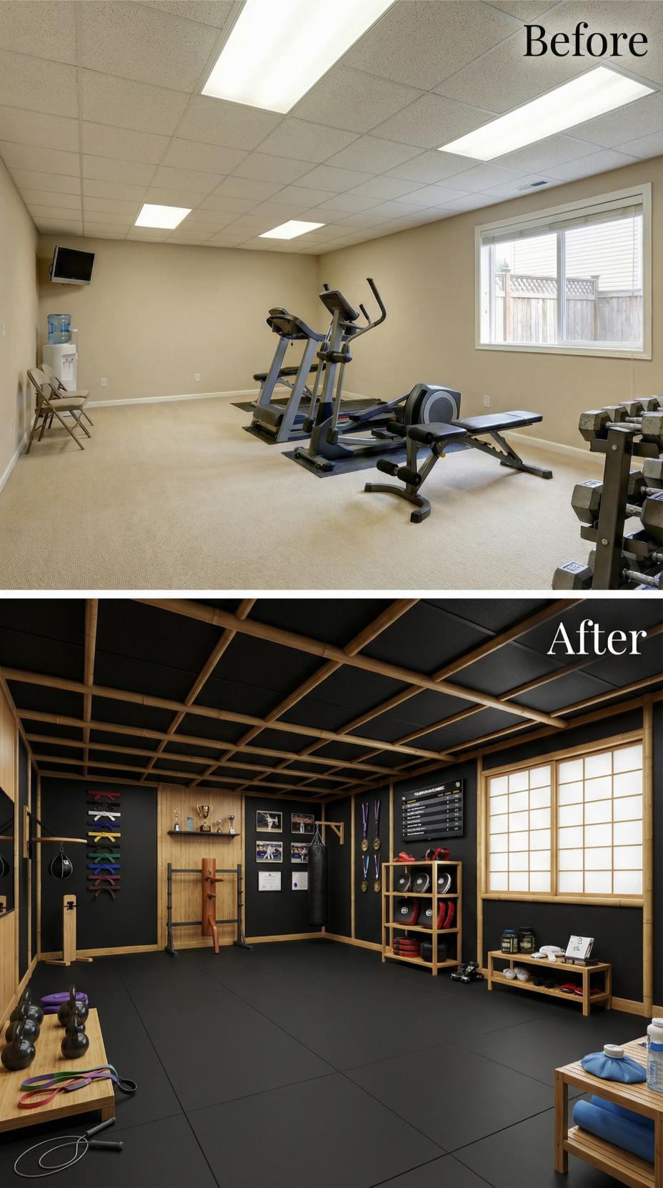 Rich bamboo shelving and dramatic black walls completely reimagine this formerly bland builder-grade home gym for competitive people. The exposed ceiling beams create striking geometric patterns while custom storage displays martial arts equipment like trophies and colored belts. Dark rubber flooring replaces basic carpeting, and the Japanese-inspired sliding screen window adds authentic dojo atmosphere perfect for serious training sessions.