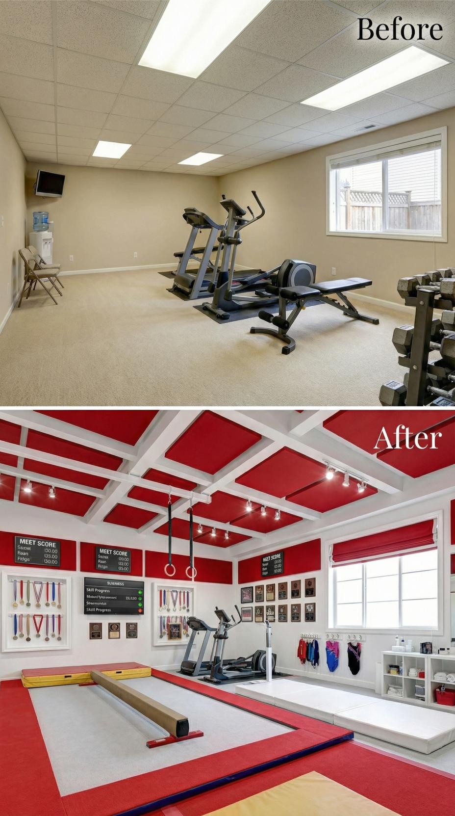 Bold red ceiling panels and pristine white beams transform this once-bland builder-grade home gym into a competitive athlete’s paradise. Custom scoreboards display meet results while medal displays and gymnastics ribbons celebrate achievements. Professional-grade equipment sits atop specialized flooring, creating designated zones for different training activities. Track lighting illuminates every corner, ensuring optimal visibility for serious workouts and skill development.