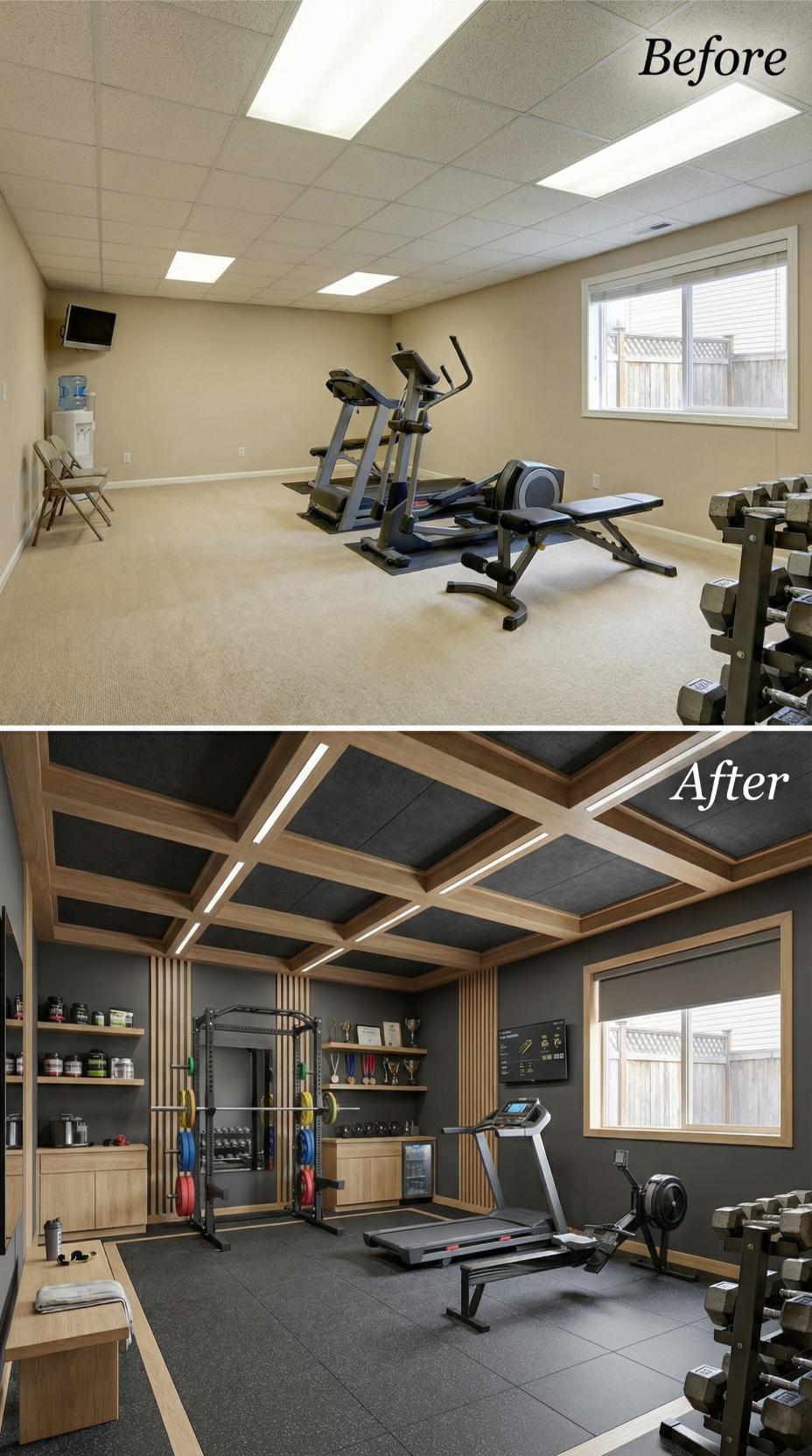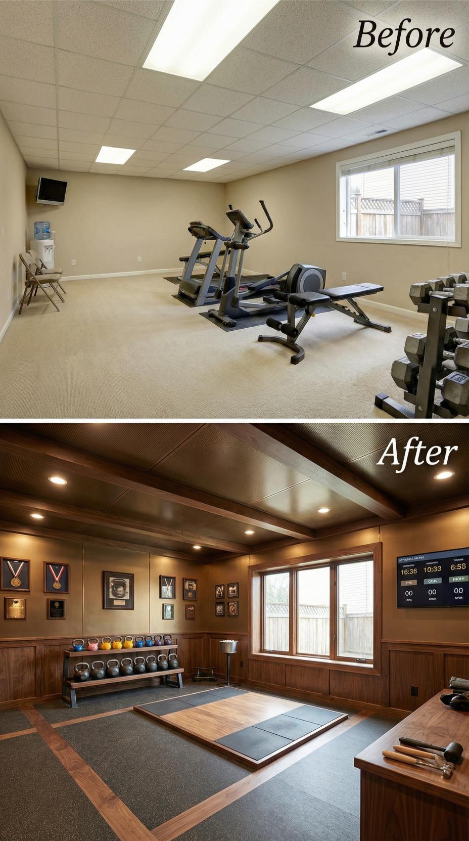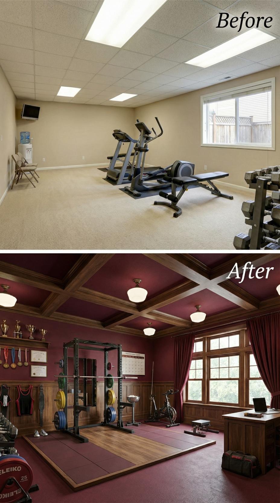 Dark charcoal walls and exposed wood beam ceilings elevate this once-bland builder-grade home gym into a sophisticated training sanctuary. Custom floating shelves organize supplements and gear while warm wood accents soften the industrial aesthetic. Strategic lighting highlights the coffered ceiling design, creating dramatic depth. Professional-grade rubber flooring replaces basic carpet, providing superior shock absorption. Built-in storage solutions maximize functionality while maintaining clean lines throughout the transformed space.