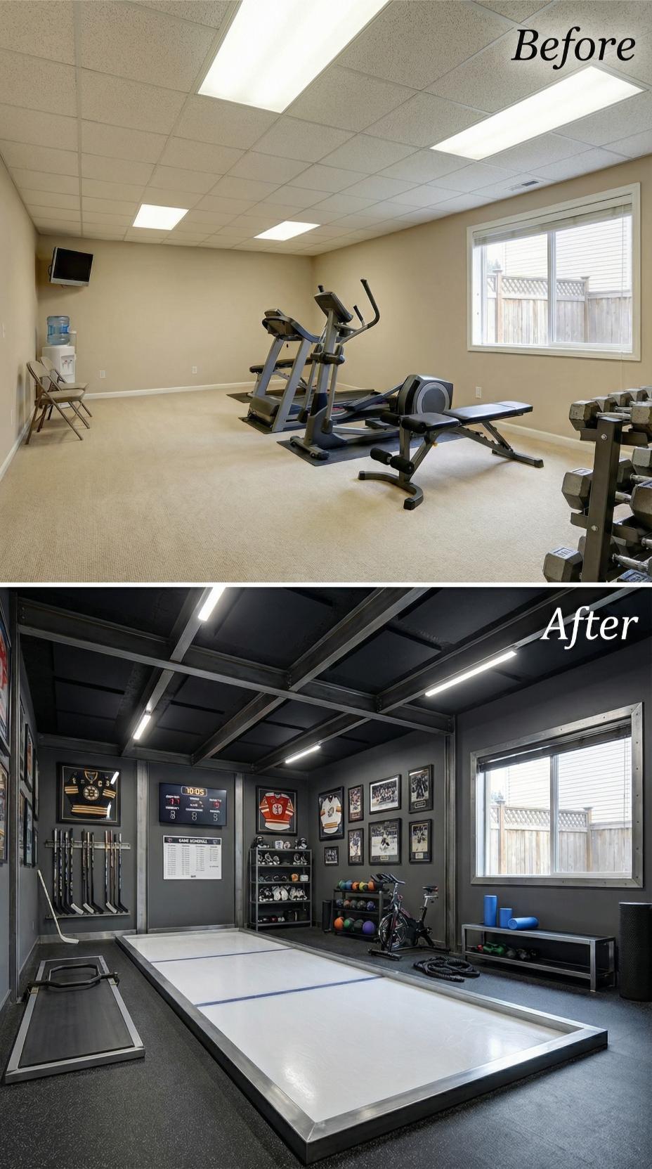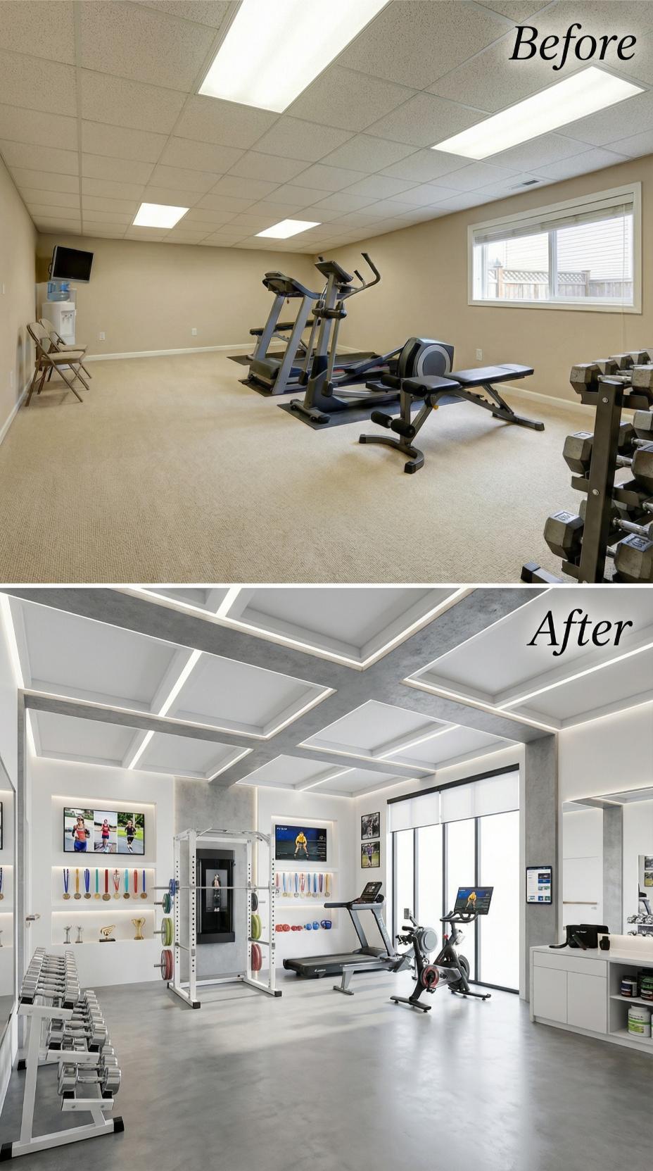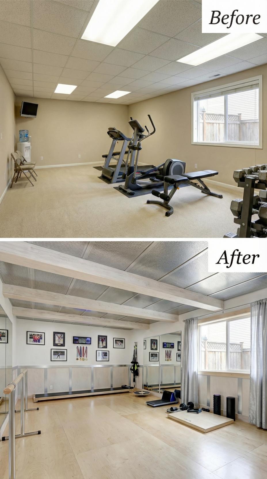 Dark charcoal walls and exposed wood beam ceilings elevate this once-bland builder-grade home gym into a sophisticated training sanctuary. Custom floating shelves organize supplements and gear while warm wood accents soften the industrial aesthetic. Strategic lighting highlights the coffered ceiling design, creating dramatic depth. Professional-grade rubber flooring replaces basic carpet, providing superior shock absorption. Built-in storage solutions maximize functionality while maintaining clean lines throughout the transformed space.