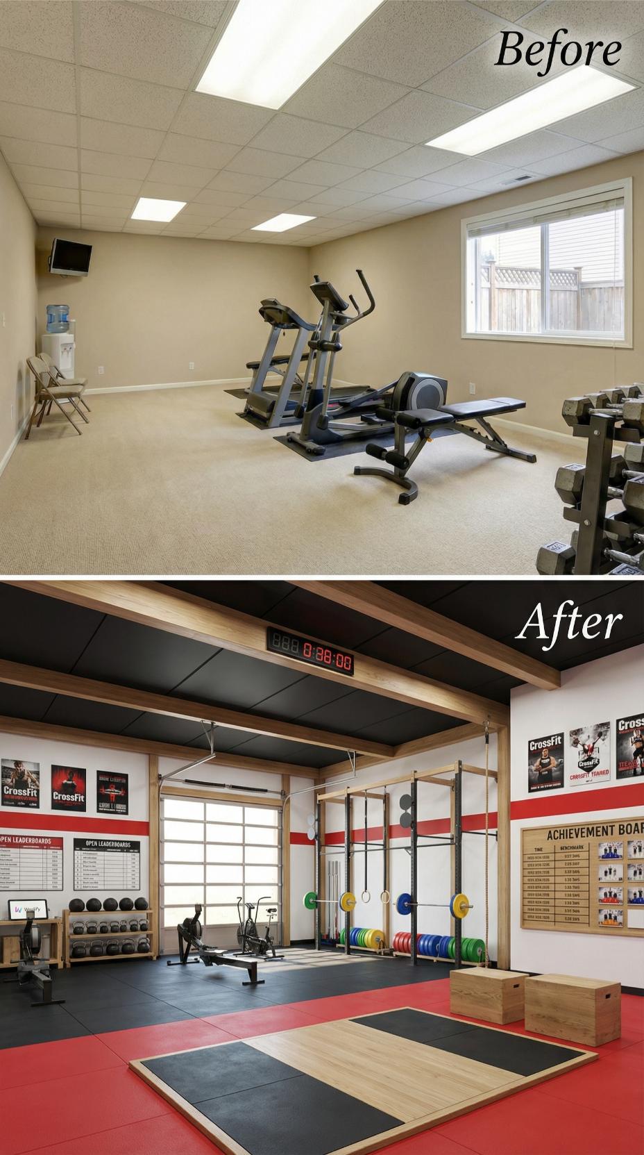 Exposed wooden beams and bold black accents transform this builder-grade home gym into a serious training facility. The original carpeted space with standard equipment gives way to professional rubber flooring, Olympic lifting stations, and wall-mounted achievement boards. Colorful weight plates, gymnastic rings, and CrossFit branding create an authentic box atmosphere that motivates competitive athletes to push their limits daily.