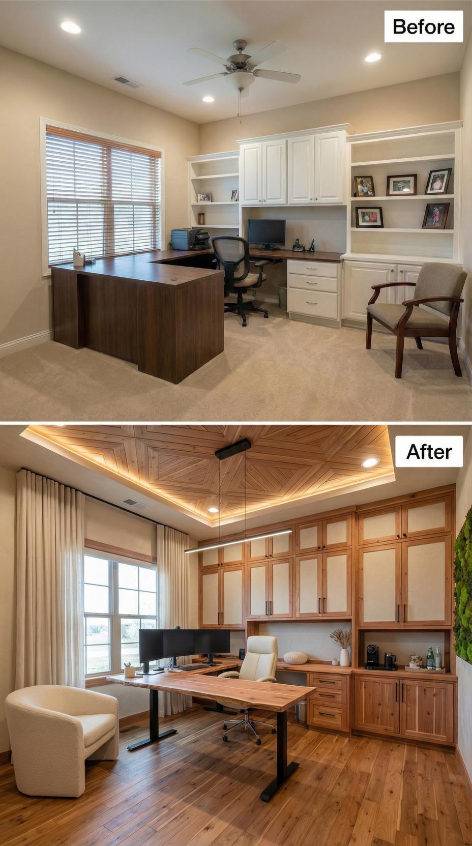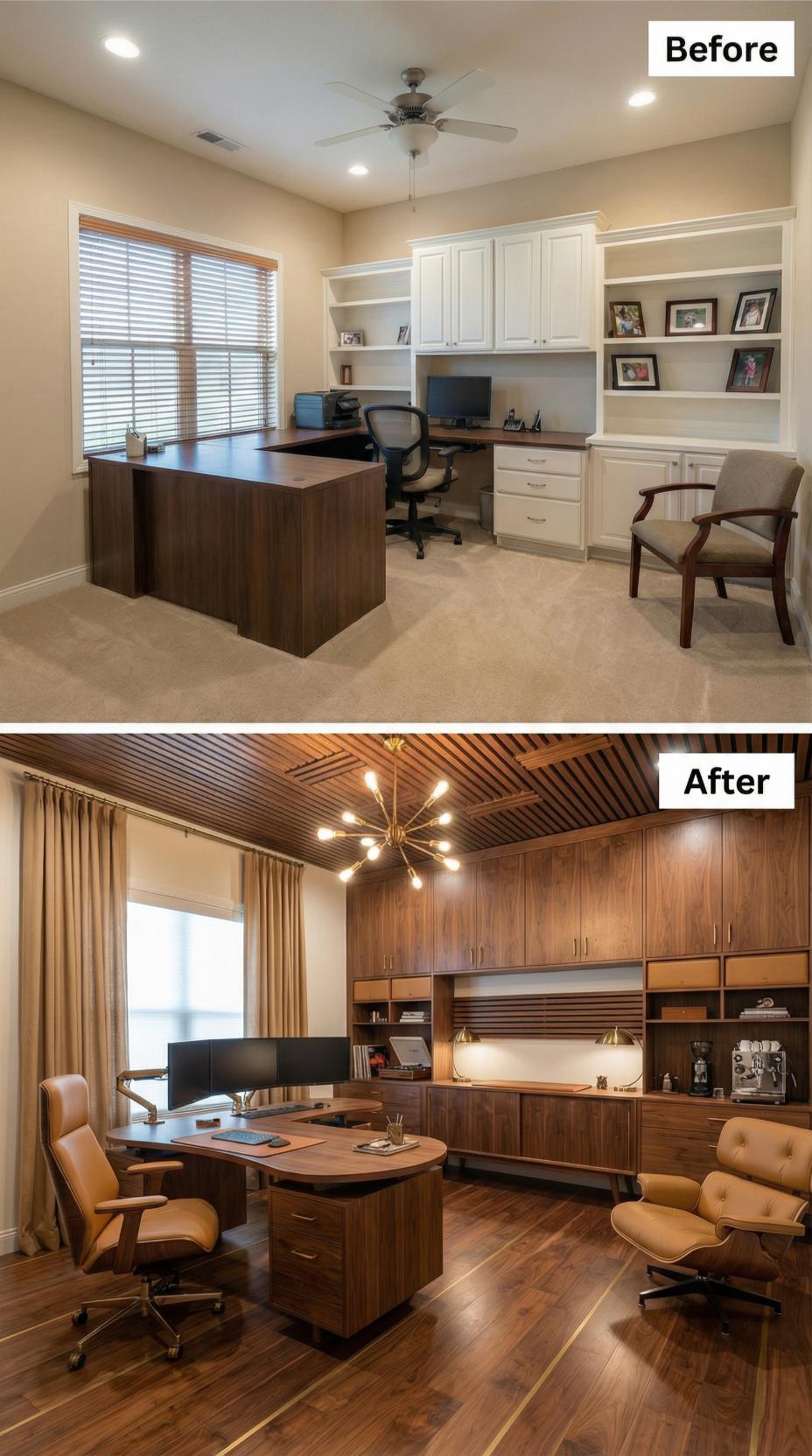 Warm walnut cabinetry and a stunning wood slat ceiling completely reimagine this builder-grade home office into a mid-century masterpiece. The transformation replaces basic white built-ins with floor-to-ceiling storage featuring horizontal wood grain details and integrated lighting. Rich hardwood floors, luxurious leather seating, and a dramatic sputnik chandelier elevate the workspace from standard to sophisticated, while flowing curtains soften the window treatment for a polished executive aesthetic.