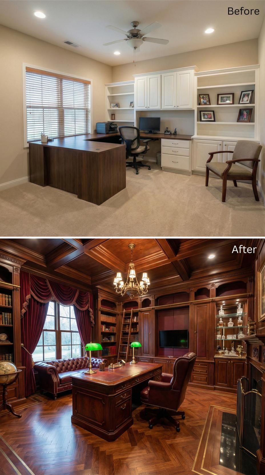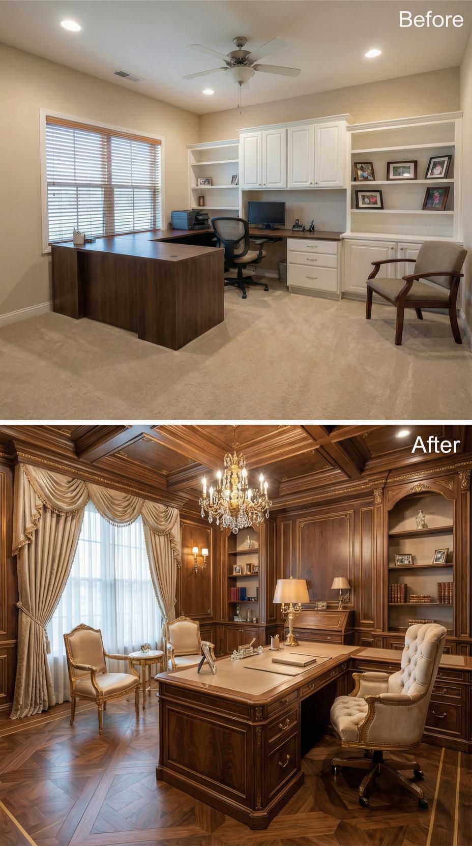 Rich walnut paneling transforms a mundane builder-grade home office into a luxurious executive sanctuary worthy of corporate boardrooms. Ornate coffered ceilings replace simple drywall, while a magnificent crystal chandelier adds dramatic elegance overhead. Custom built-ins showcase leather-bound volumes and personal treasures, creating sophisticated storage solutions. Sumptuous drapery frames windows that once featured basic blinds, completing this remarkable metamorphosis.