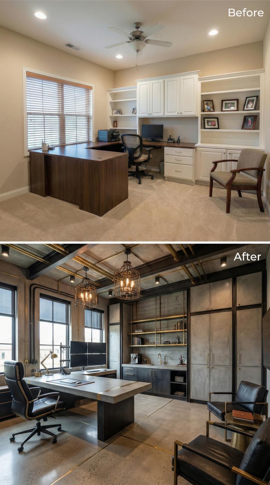 Dark steel frameworks and exposed ceiling beams dramatically elevate this workspace from bland builder-grade cabinetry to sophisticated industrial luxury. The transformation replaces basic white storage with custom metal shelving, concrete countertops, and rich leather seating. Dramatic pendant lighting and floor-to-ceiling windows create an executive atmosphere, while integrated coffee stations and open shelving showcase curated collections instead of cluttered personal items.