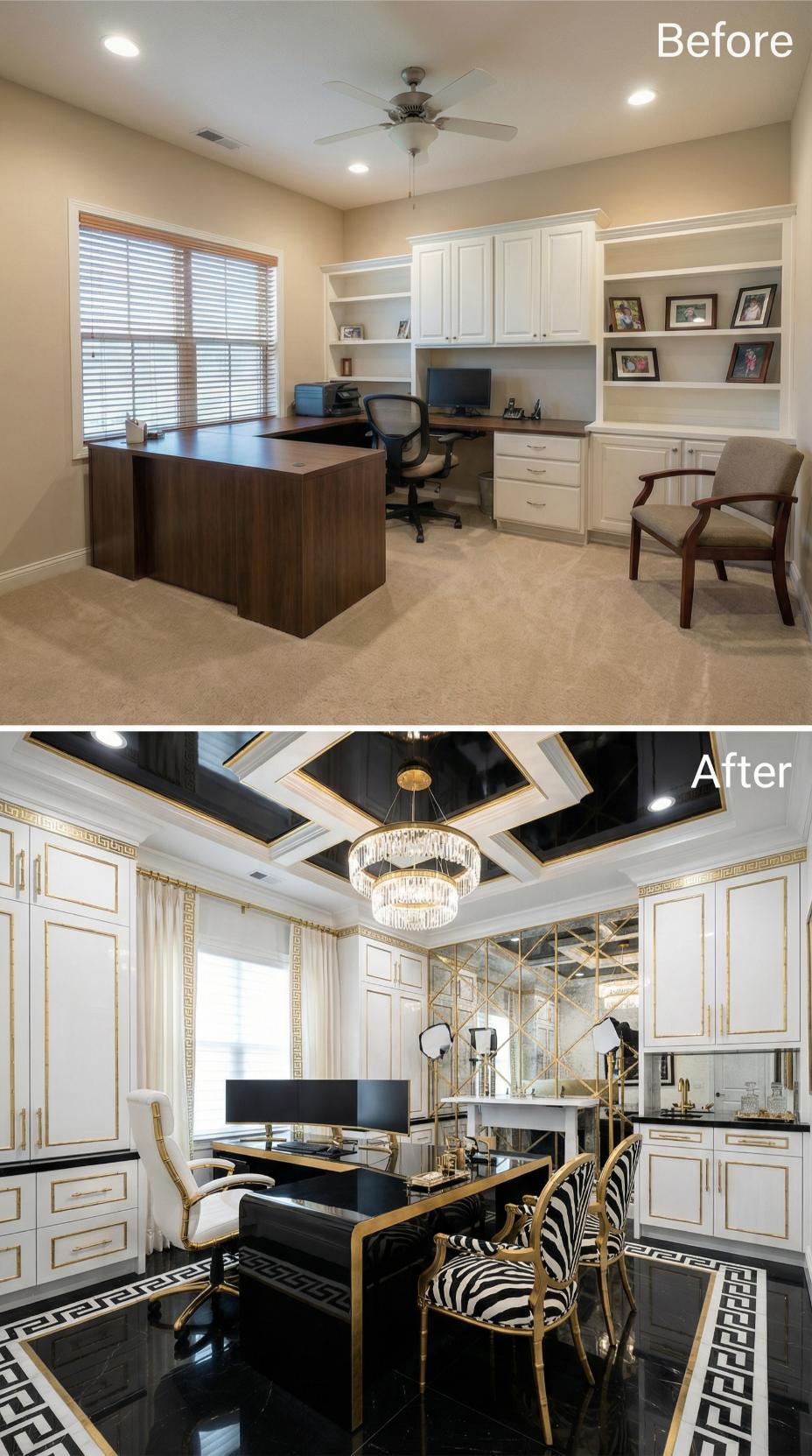 Dramatic transformation elevates this builder-grade home office through luxurious black lacquered floors, ornate coffered ceilings, and gleaming gold accents. White cabinetry receives sophisticated gold trim detailing while a stunning crystal chandelier replaces basic ceiling fans. Geometric mirror panels and zebra-striped seating create bold visual impact, converting the mundane workspace into an extravagant executive sanctuary perfect for ambitious workaholics.