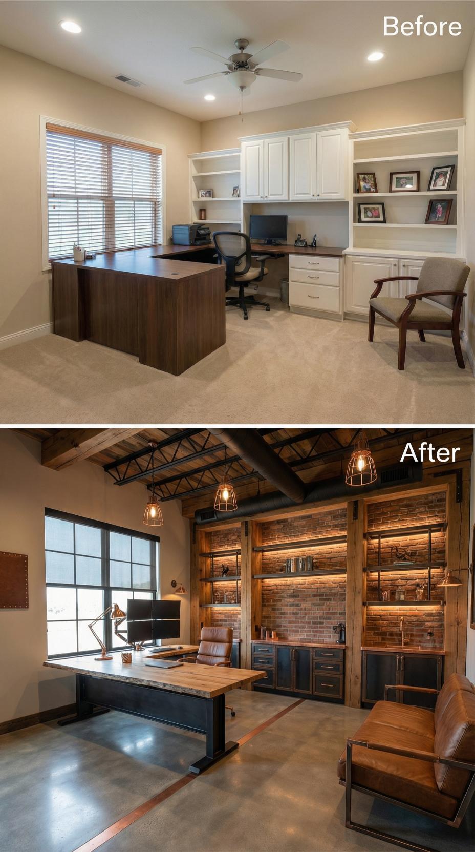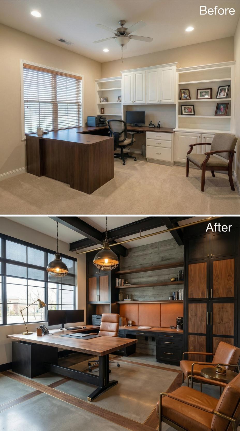 Exposed ceiling beams and weathered concrete floors replace bland carpeting and standard drywall in this dramatic office makeover. The transformation introduces rich leather seating, custom metal shelving with integrated LED lighting, and floor-to-ceiling windows that flood the workspace with natural light. Mixed materials including reclaimed wood cabinetry and industrial pendant fixtures create a sophisticated executive environment that abandons cookie-cutter builder elements.