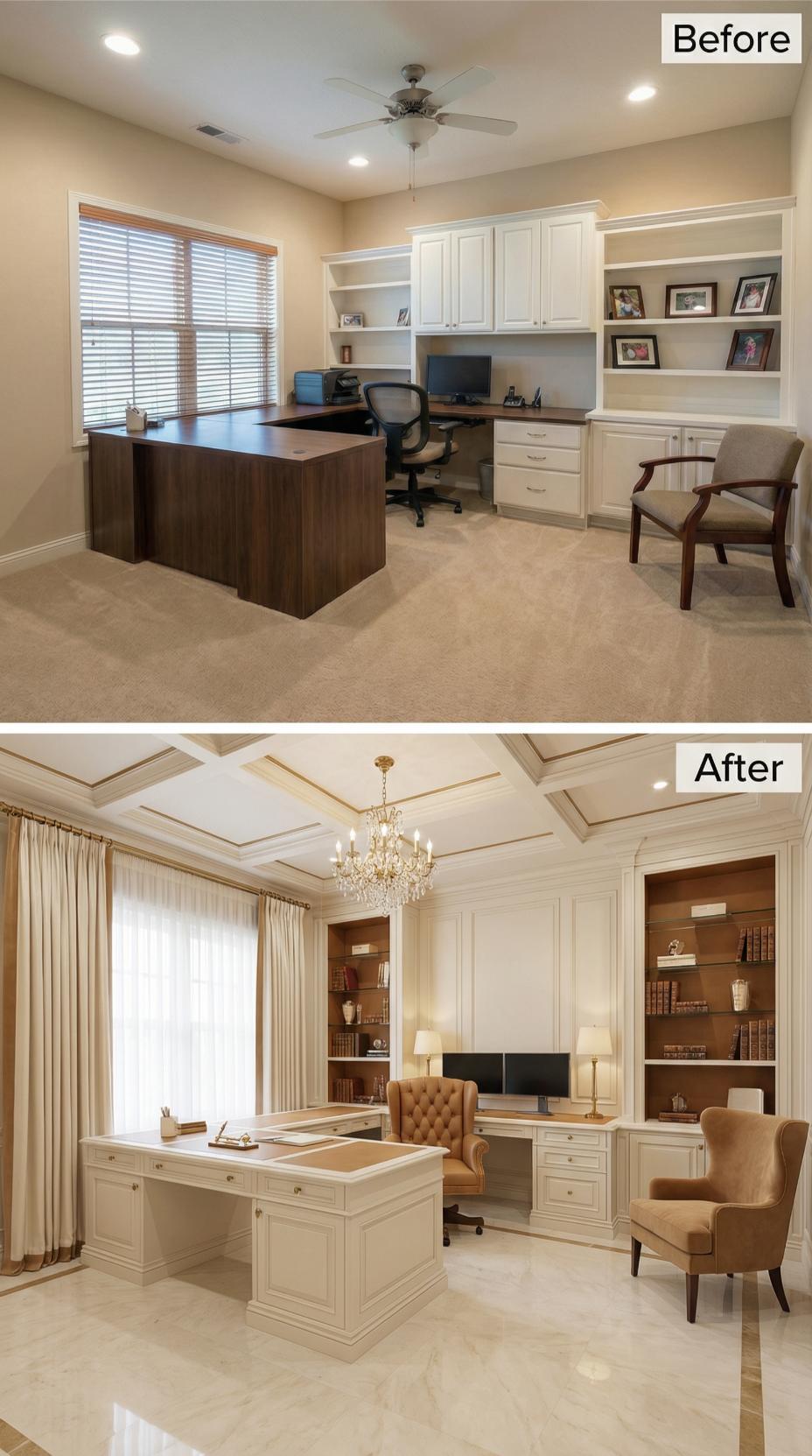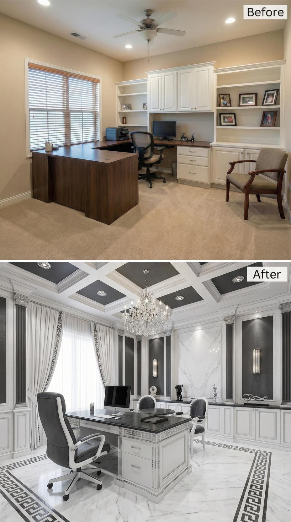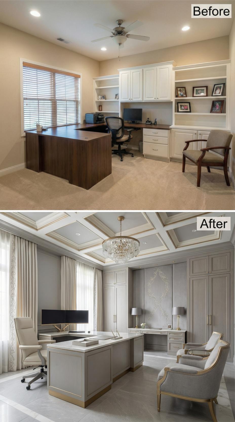 Coffered ceilings with gold accents replace a simple flat ceiling, instantly elevating this workspace from mundane to magnificent. The transformation swaps out basic white cabinetry for rich gray millwork with classical detailing, while a crystal chandelier commands attention overhead. Luxurious drapery frames the windows instead of simple blinds, and an ornate accent wall creates a stunning focal point behind the refined desk area.