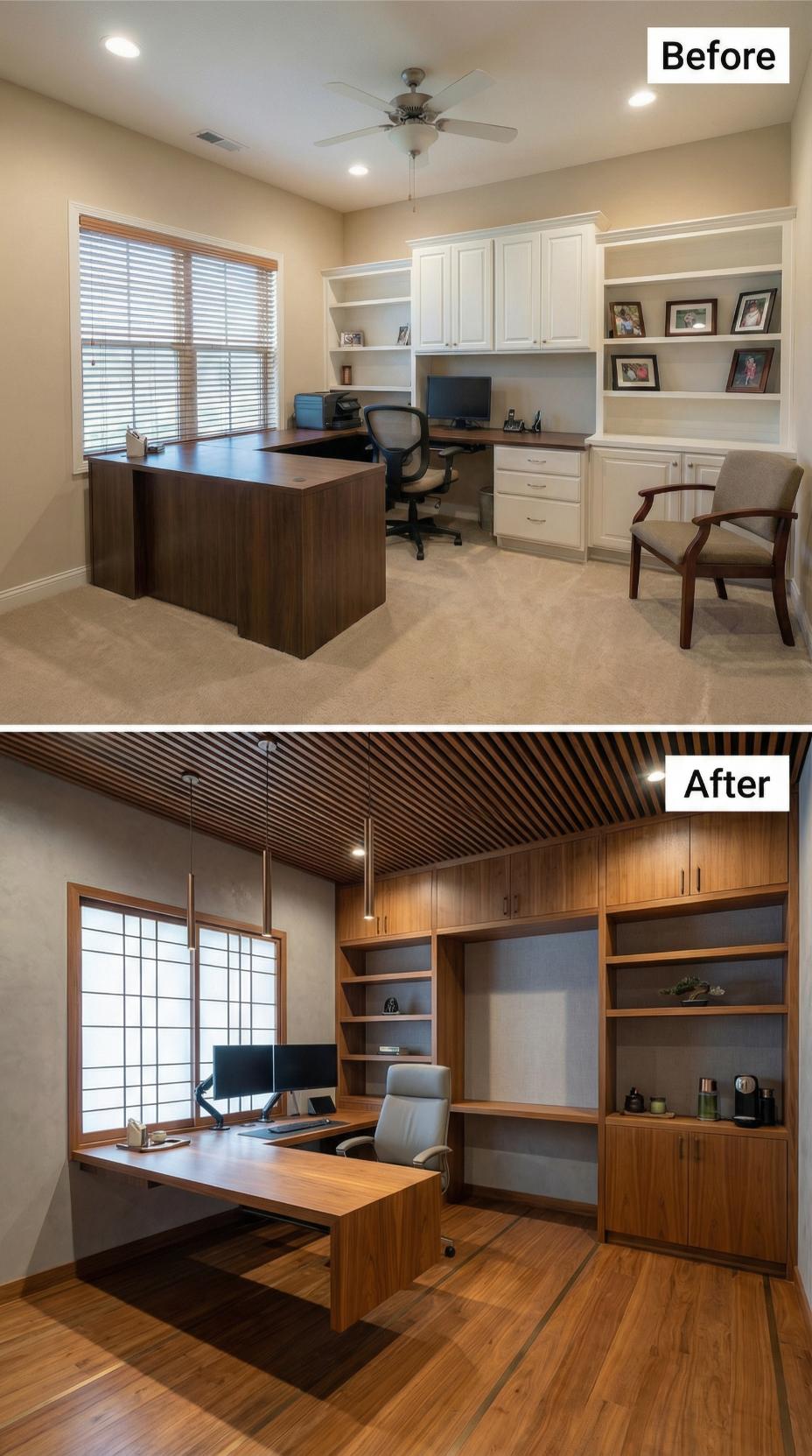 Rich walnut wood transforms this formerly generic builder-grade home office into a serene, Japanese-inspired sanctuary. The renovation replaces standard white cabinetry with sleek wooden built-ins that extend floor-to-ceiling, creating impressive storage and display space. A dramatic slatted wood ceiling adds architectural interest while pendant lighting illuminates the custom floating desk. Hardwood floors and clean geometric lines complete the zen-like atmosphere perfect for focused productivity.