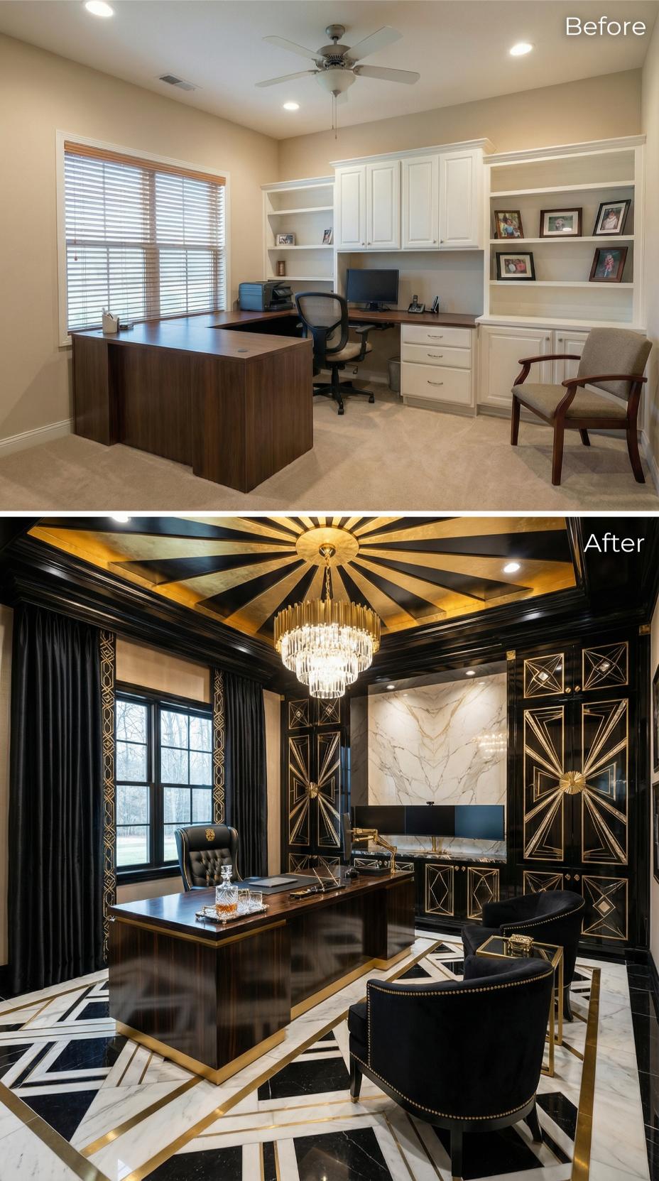 Dramatic black cabinetry with intricate gold geometric patterns replaces the basic white storage of this builder-grade home office for workaholics. A stunning crystal chandelier and coffered ceiling with radiating gold details create an opulent atmosphere above the sleek marble accent wall. Rich black leather chairs and geometric flooring transform the neutral workspace into a sophisticated executive retreat that commands attention and inspires productivity.