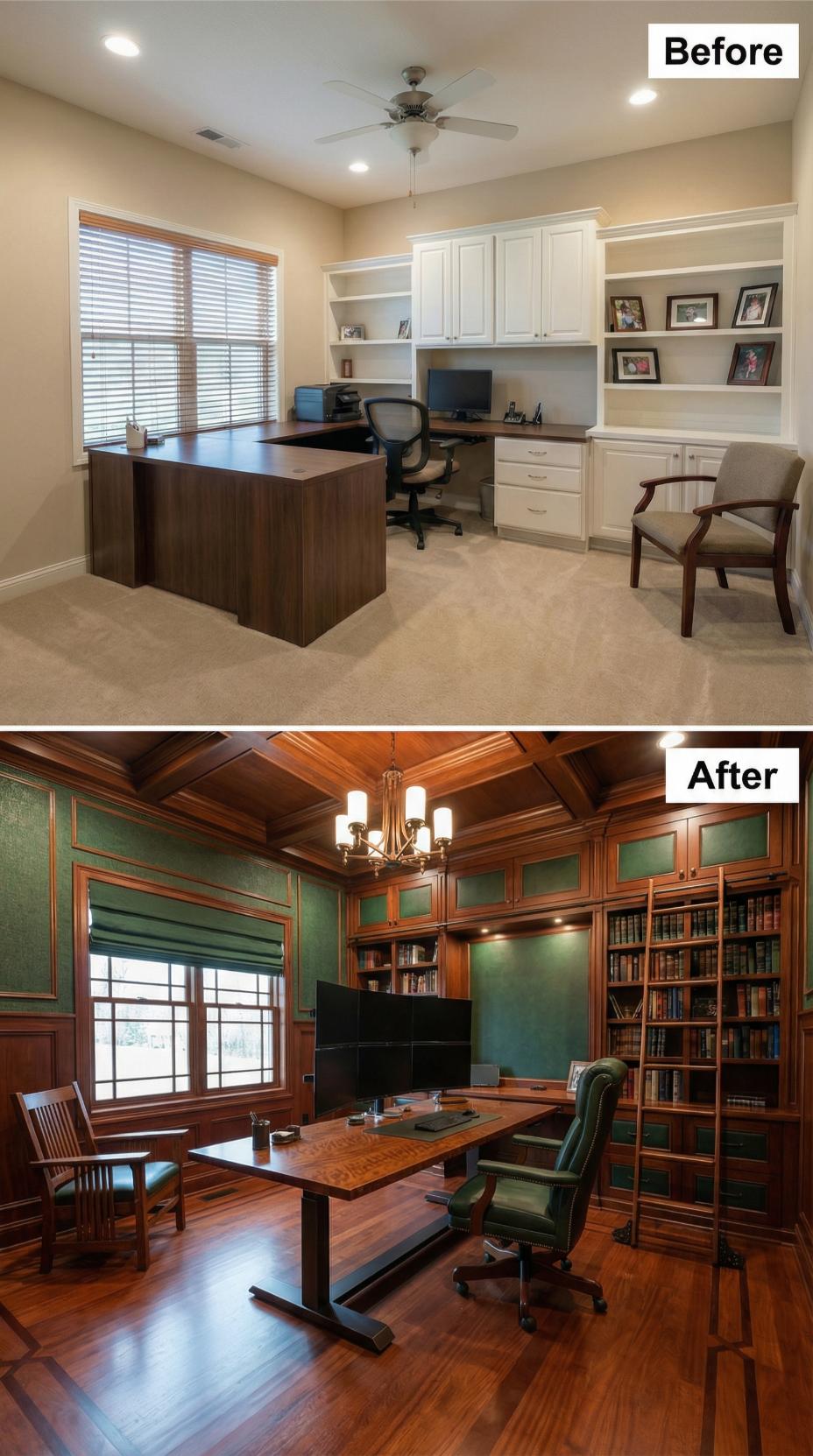 Rich walnut paneling transforms this builder-grade home office into a distinguished executive retreat worthy of a private club. Floor-to-ceiling built-in bookshelves replace generic white cabinetry, while deep emerald accent walls add dramatic sophistication. The coffered ceiling, bronze chandelier, and hardwood floors elevate the mundane beige workspace into a refined sanctuary that commands respect and inspires productivity.