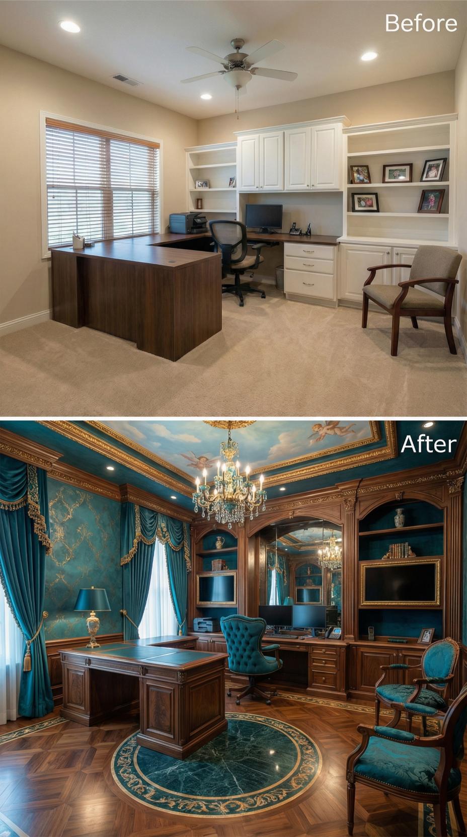 Luxurious teal silk wallpaper and gilded molding transform this mundane builder-grade home office into a sophisticated executive retreat. Rich mahogany built-ins replace basic white cabinetry, while an ornate crystal chandelier elevates the ceiling treatment. Plush tufted seating in coordinating teal velvet, elaborate window treatments with golden swags, and an intricate parquet floor create an atmosphere of refined elegance befitting any workaholic’s dream workspace.