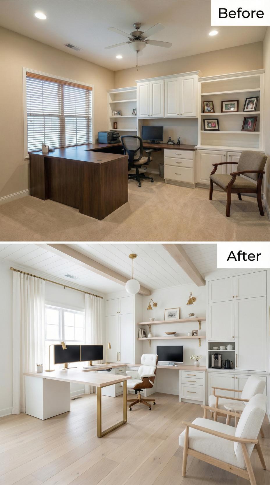 Warm brass accents and clean white cabinetry completely transformed this builder-grade home office for workaholics into a serene workspace. The heavy dark wood desk gave way to a sleek white surface with golden legs, while floating shelves replaced cluttered built-ins. White curtains and exposed ceiling beams brighten the entire room, creating an airy atmosphere perfect for productive work sessions.