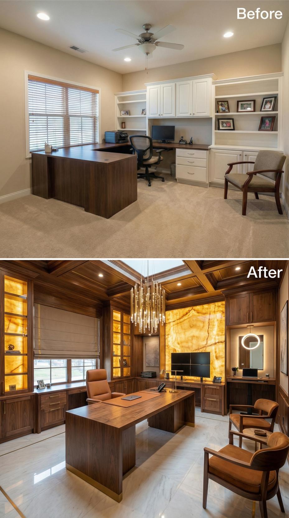 Rich walnut millwork transforms this builder-grade home office into an executive sanctuary worthy of a CEO. Coffered ceilings with integrated lighting replace basic drywall, while backlit onyx creates a stunning focal wall behind dual monitors. Custom cabinetry with glass-front displays and warm LED strips elevates storage beyond basic white boxes. The modern chandelier and leather seating complete this sophisticated workspace upgrade.