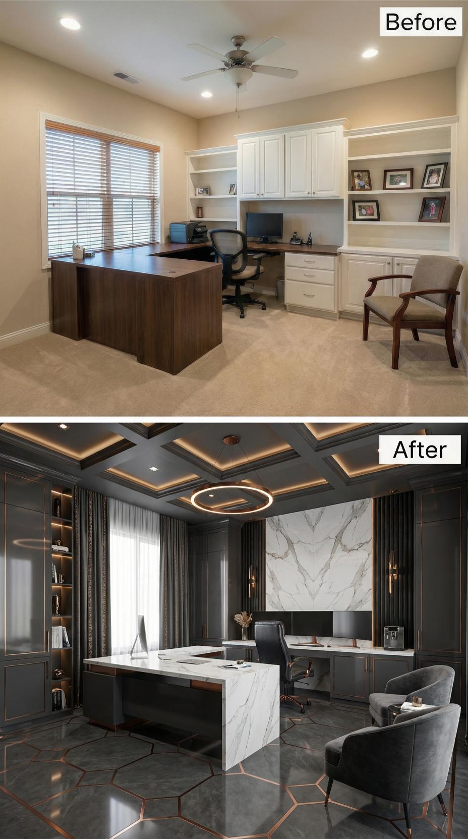 Dramatic dark millwork and coffered ceilings transform this builder-grade home office into a luxurious executive retreat. Rich charcoal cabinetry replaces basic white storage, while stunning marble surfaces elevate the workspace from ordinary to extraordinary. Sophisticated lighting, including LED strips and a striking circular pendant, creates ambiance that rivals high-end corporate boardrooms. Hexagonal flooring and plush velvet seating complete this professional transformation.