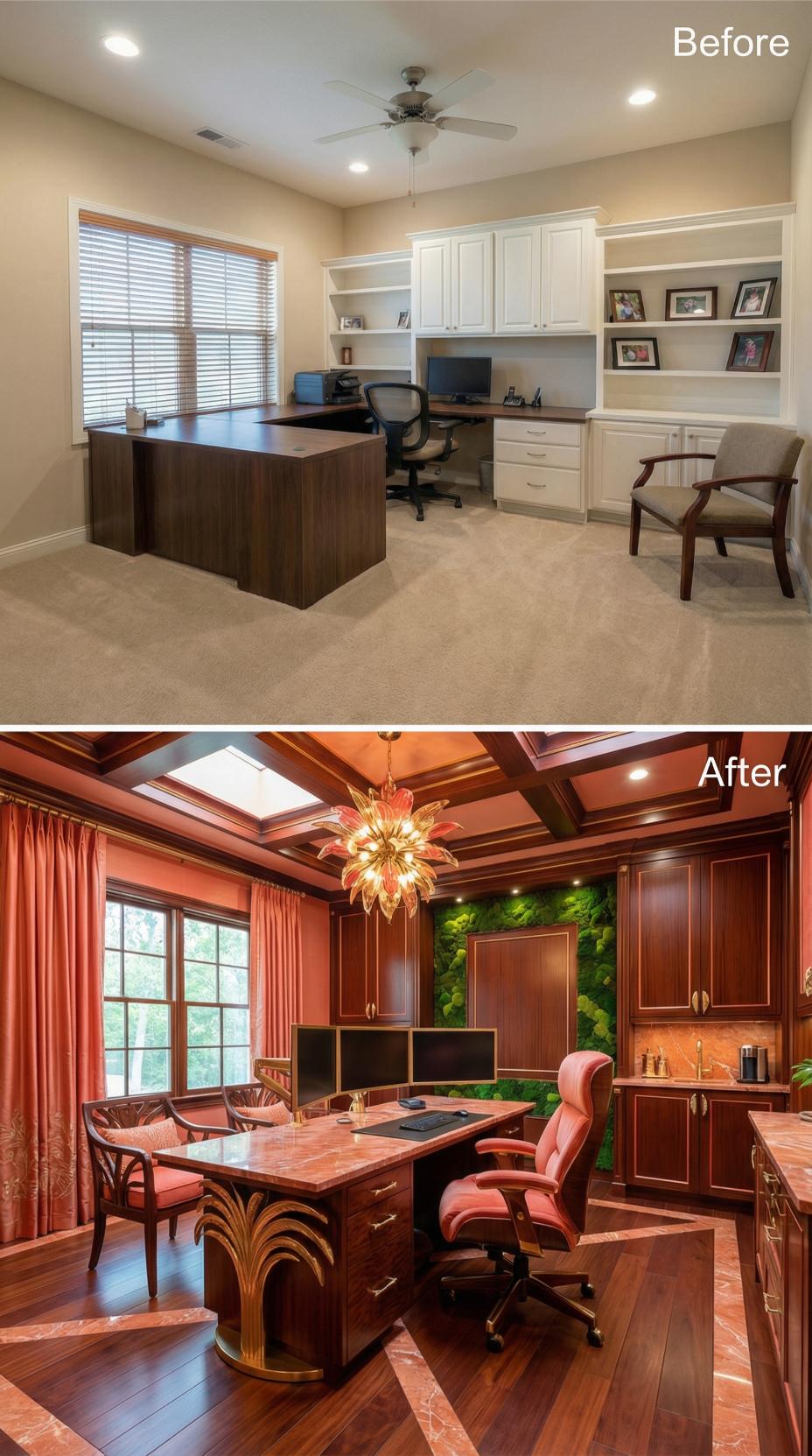 Warm mahogany cabinetry transforms this builder-grade home office into a sophisticated executive retreat. The renovation adds coffered ceilings, a dramatic skylight, and luxurious built-ins that replace basic white storage. Rich coral drapery and an artistic chandelier elevate the ambiance, while a living moss wall creates an unexpected biophilic focal point behind dual monitors.