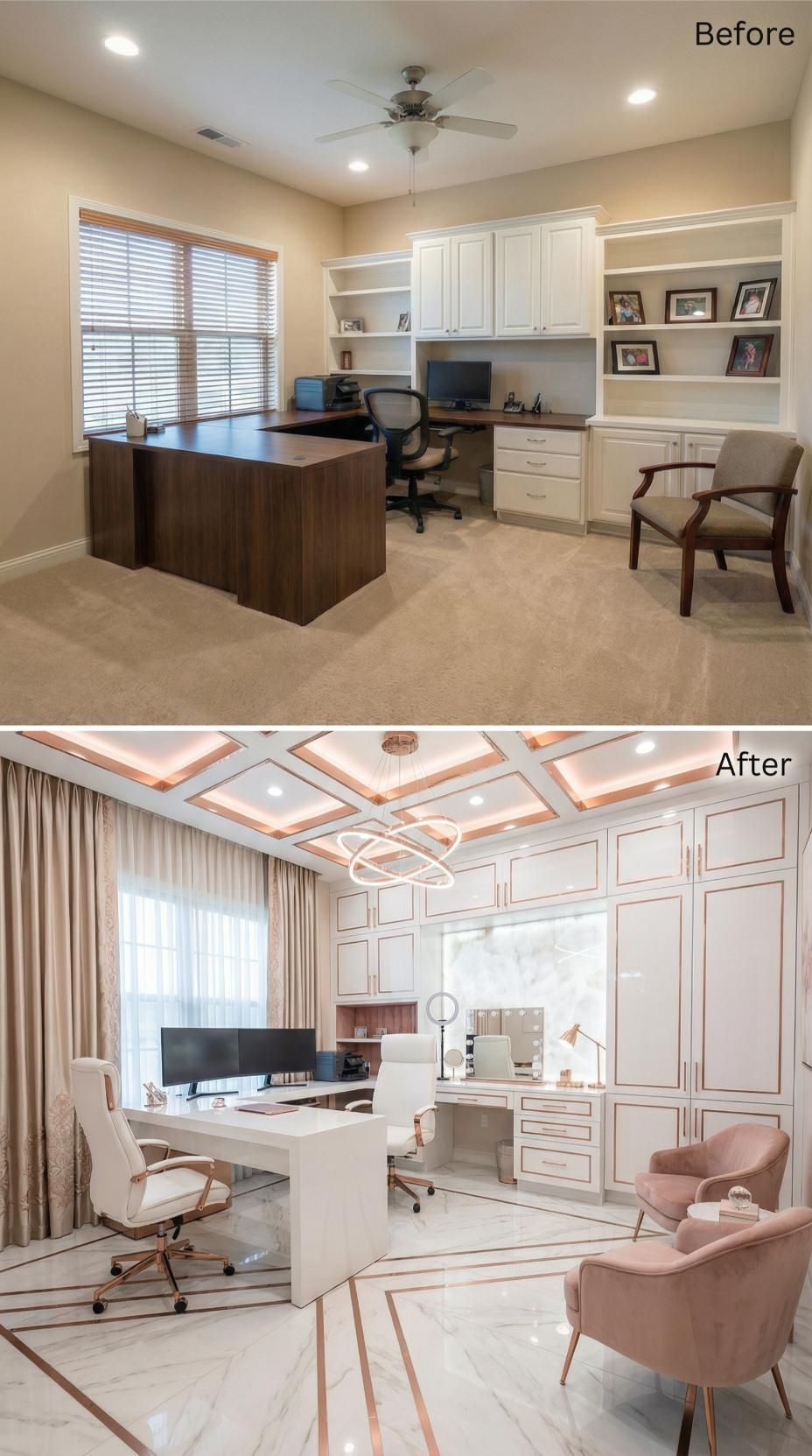 Dramatic coffered ceilings with integrated lighting replace the flat ceiling and basic fan, while luxurious rose gold accents elevate every surface. The transformation swaps dark wood furniture for a sleek white lacquer desk, introduces plush blush velvet seating, and layers in sophisticated drapery over basic blinds. Modern geometric lighting and marble flooring create an upscale workspace that transforms productivity into pure luxury.