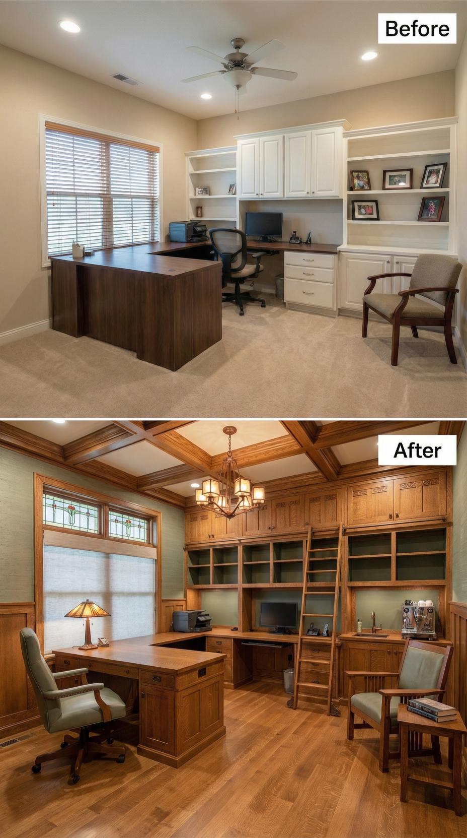 Rich wood millwork transforms this previously bland builder-grade home office into a sophisticated craftsman-style library retreat. Floor-to-ceiling cabinetry with integrated ladder system maximizes storage while coffered ceilings and stained glass accent windows add architectural gravitas. Warm hardwood flooring replaces beige carpet, and an ornate chandelier creates ambient lighting that elevates the entire workspace from corporate sterile to residential elegance.