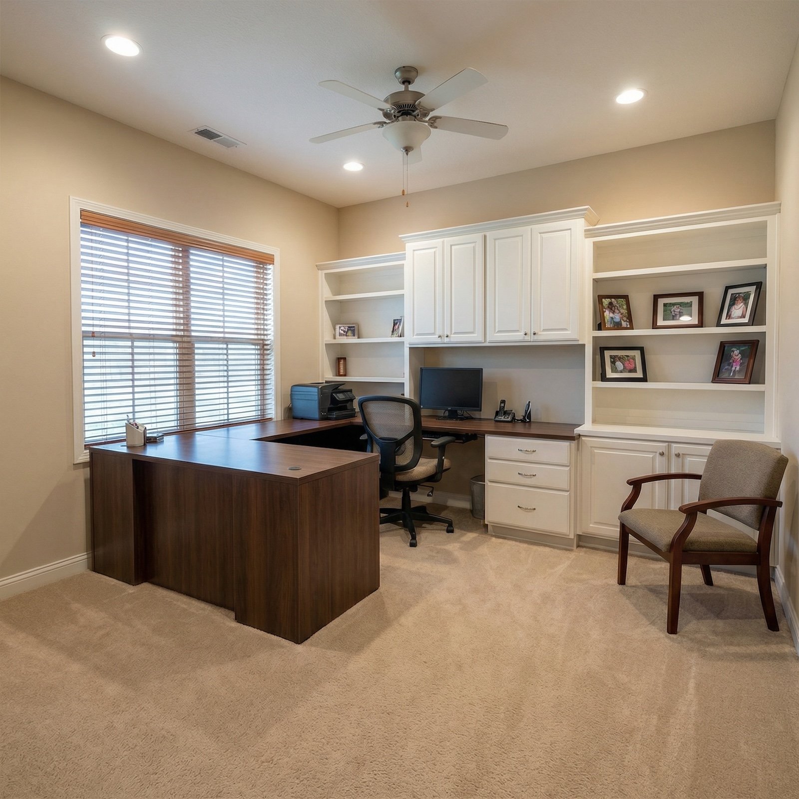Warm Wood and White Cabinetry Transform a Generic Office Layout