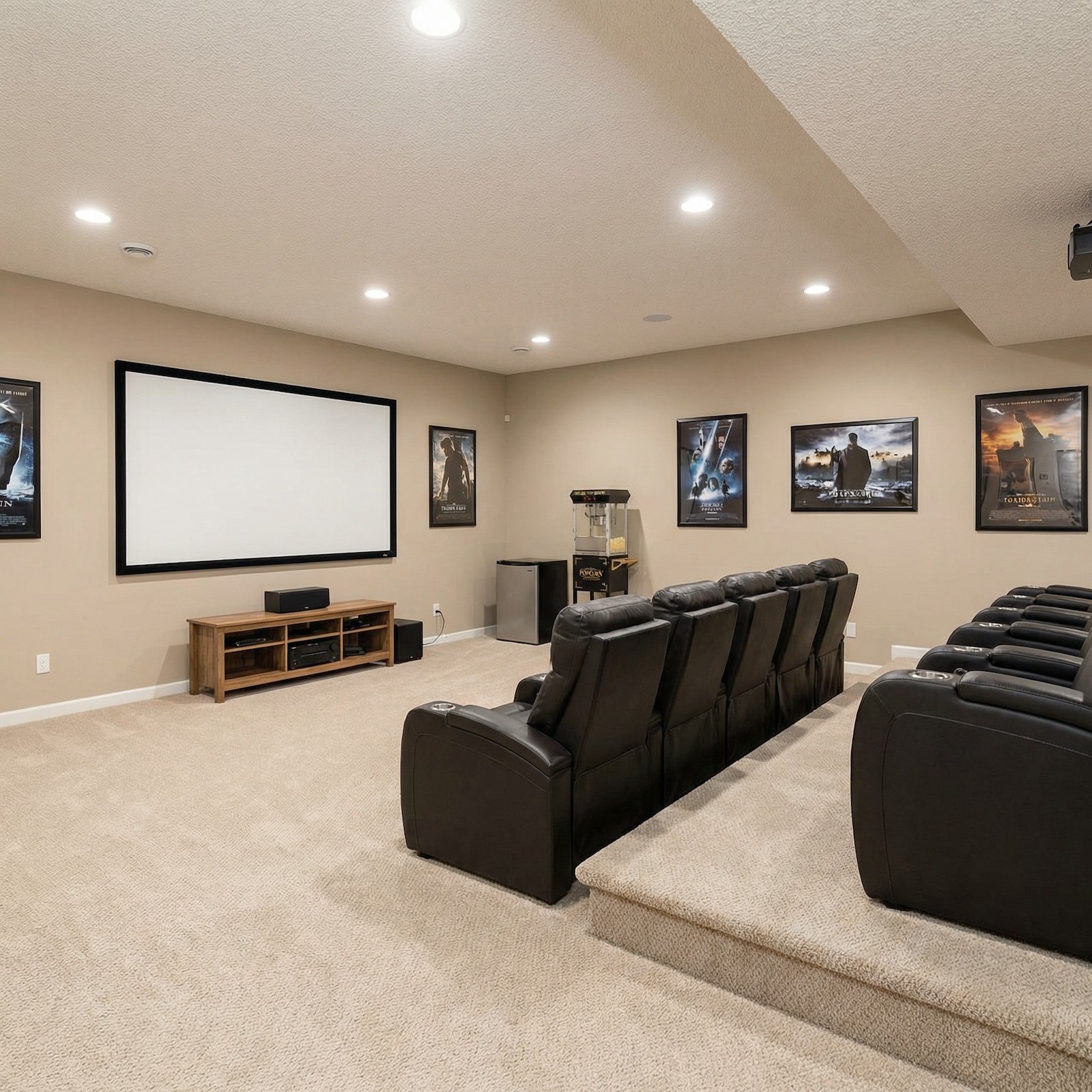 Beige carpet and black leather recliners sat beneath white popcorn ceilings in the original space. The media console was a light oak unit, and framed movie posters hung on walls painted the color of oatmeal. Recessed cans provided flat illumination across the room.