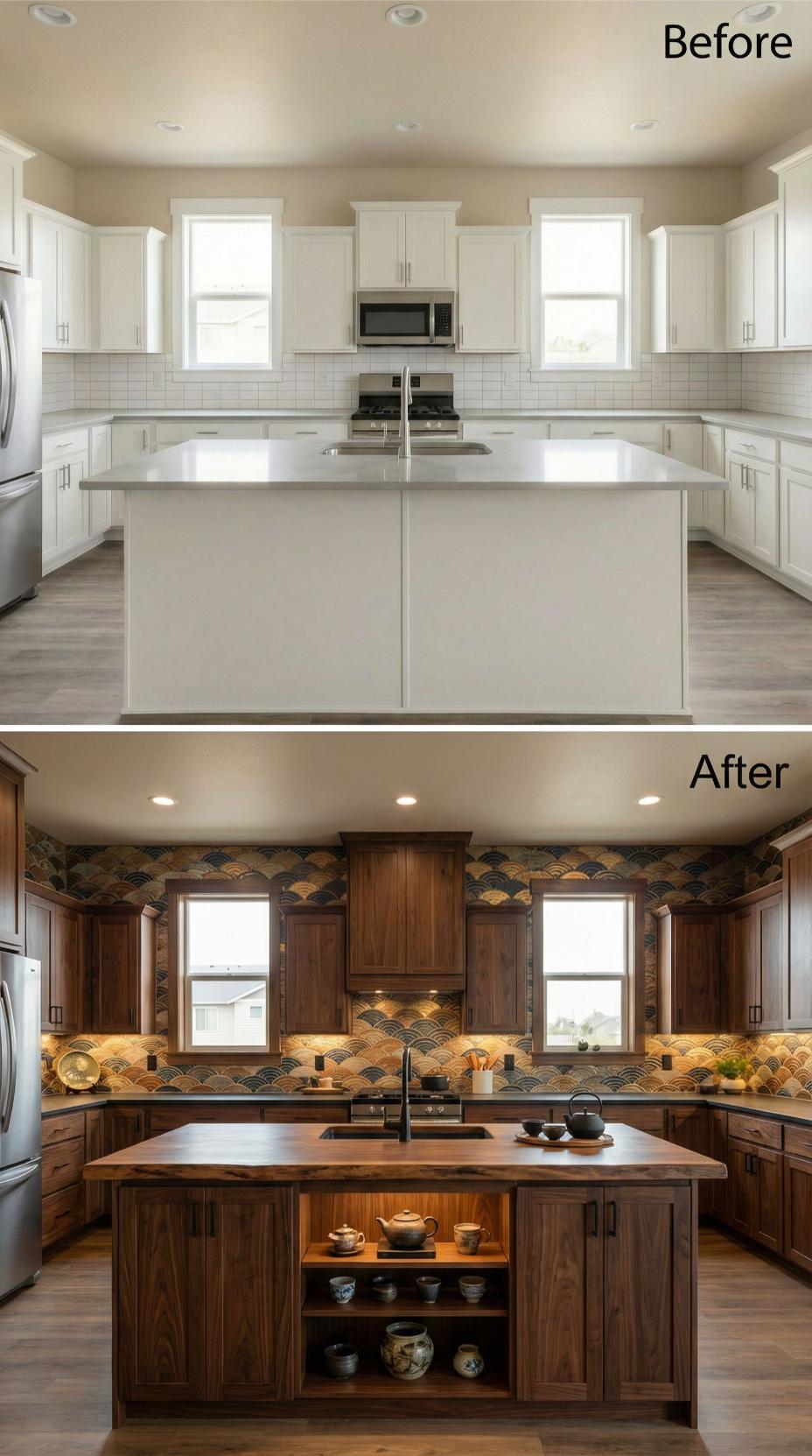 White subway tiles give way to a stunning geometric pattern that transforms this kitchen’s entire personality. Rich walnut cabinetry replaces the builder-grade white units, while the new backsplash features intricate fan-shaped tiles in deep teal and gold tones. Under-cabinet lighting illuminates the textural surface, creating dramatic shadows that emphasize each geometric element and elevate the space from standard to spectacular.