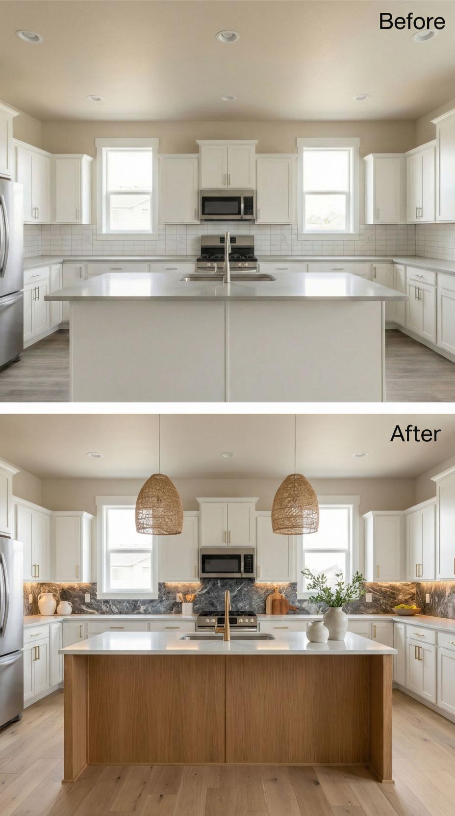 Bold black marble backsplash transforms this builder-grade kitchen backsplash into a sophisticated culinary workspace. Woven rattan pendant lights replace standard recessed lighting, casting warm ambient glow over the dramatic stone surface. Natural wood island base adds organic warmth while brass fixtures elevate the overall aesthetic. Strategic styling with pottery and greenery creates visual interest against the striking marble veining.