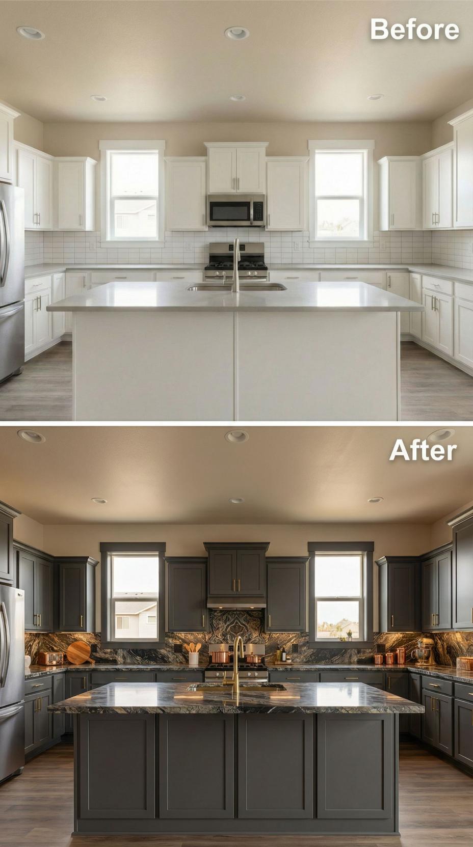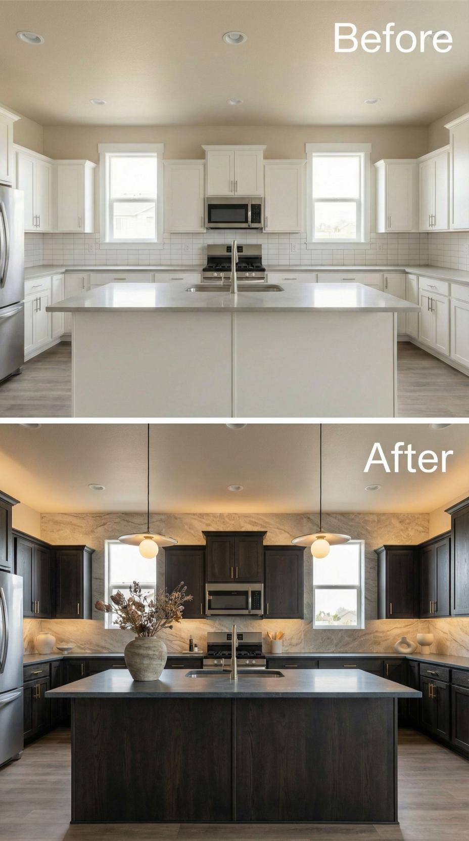 Dark espresso cabinets completely transform this kitchen’s personality, replacing the previous all-white builder-grade aesthetic with sophisticated depth. Luxurious marble backsplash extends dramatically to the ceiling, creating stunning visual impact while warm under-cabinet lighting adds intimate ambiance. Globe pendant lights float gracefully above the island, perfectly balancing the bold dark cabinetry with contemporary elegance and functional task lighting.