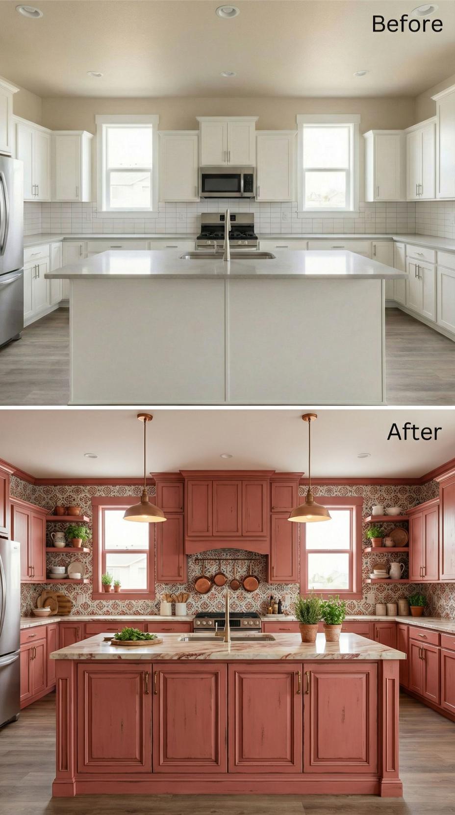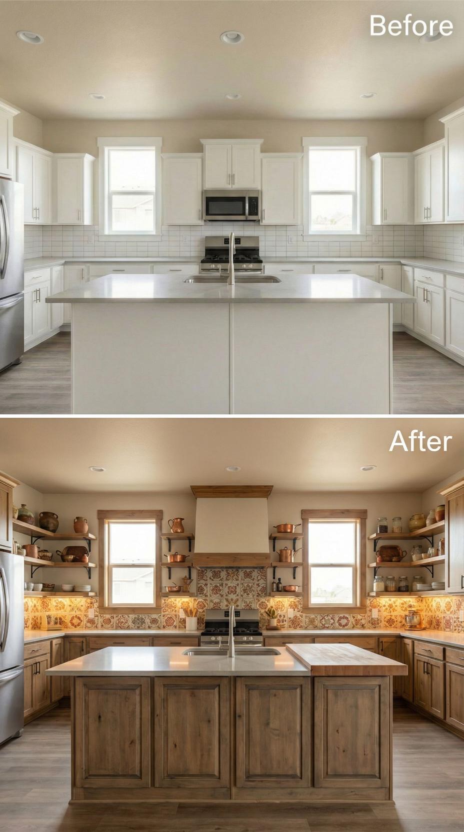 Builder-grade kitchen backsplash transforms dramatically with intricate Mediterranean mosaic tiles featuring warm terracotta and cream geometric patterns. Rich rust-colored cabinetry replaces stark white units, while copper pendant lights and open shelving create an inviting Old World charm. Natural wood countertops and strategically placed pottery complete this stunning metamorphosis from bland to breathtaking.