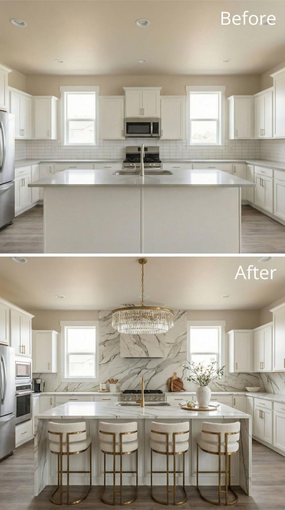 Bold Calacatta marble transforms this builder-grade kitchen backsplash into a stunning focal point that commands attention. The dramatic veining extends from countertop to ceiling, creating visual height and luxurious impact. Brass hardware coordinates beautifully with the new crystal chandelier, while neutral bar stools complement the sophisticated marble pattern for a cohesive, elevated design.