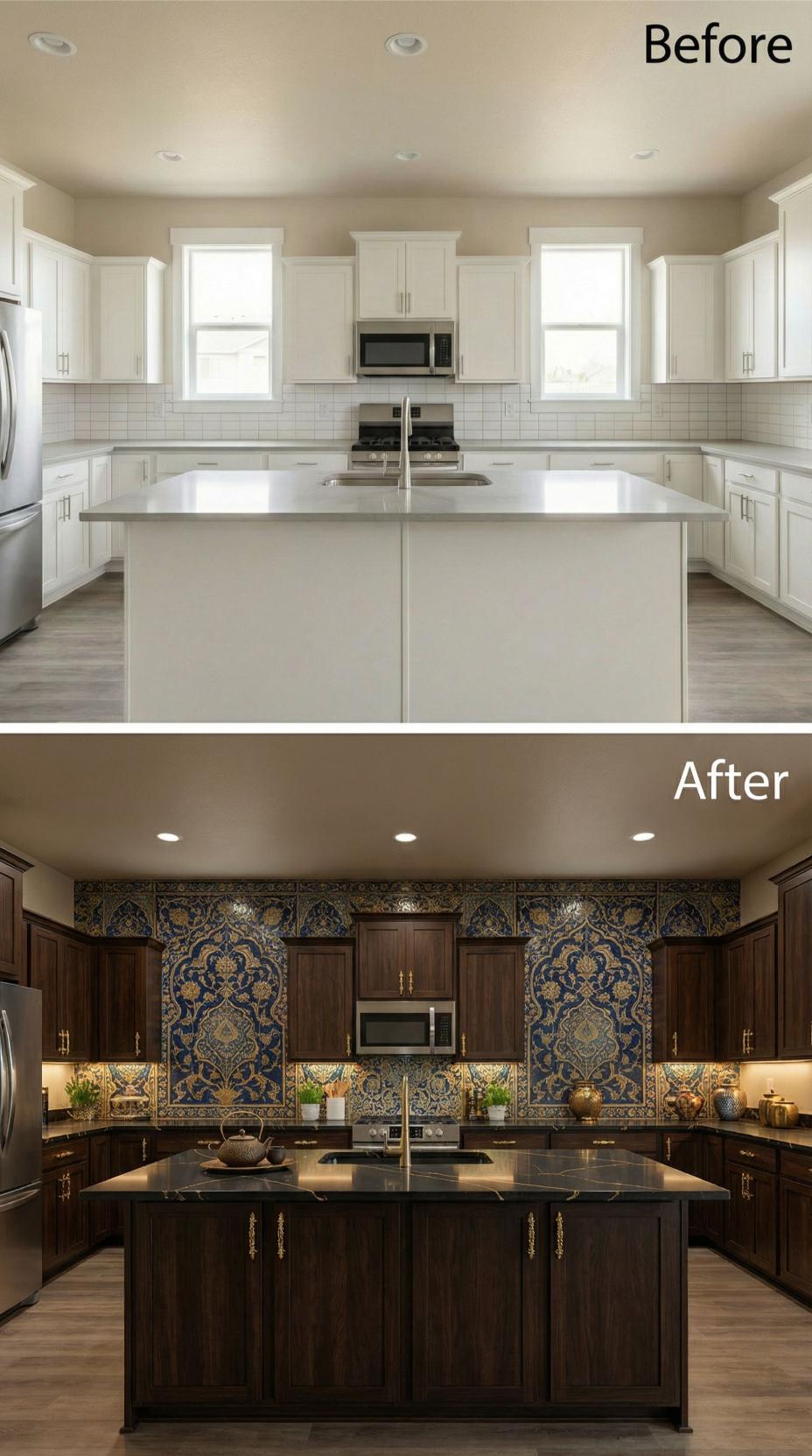 Dramatic transformation elevates this builder-grade kitchen backsplash into a stunning Mediterranean masterpiece. Rich espresso cabinets replace basic white cabinetry while intricate blue and gold mosaic tiles create an ornate focal wall. Dark quartz countertops and brass hardware complement the luxurious palette. Under-cabinet lighting illuminates the detailed tilework, transforming the entire space from bland to breathtaking with sophisticated Old World charm.