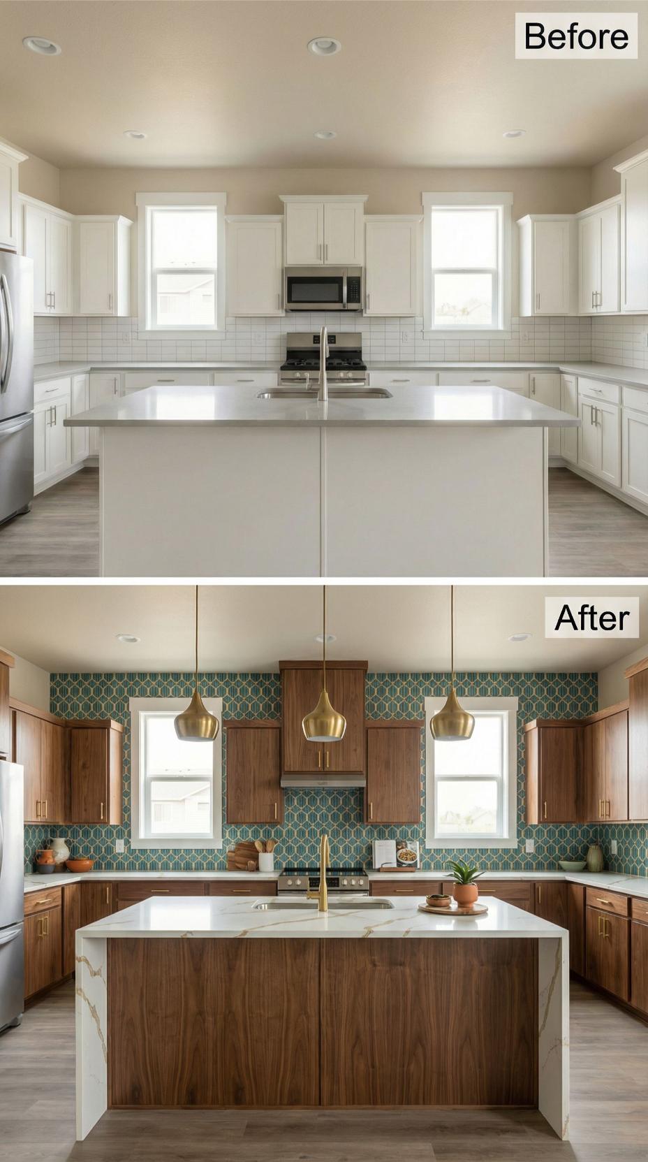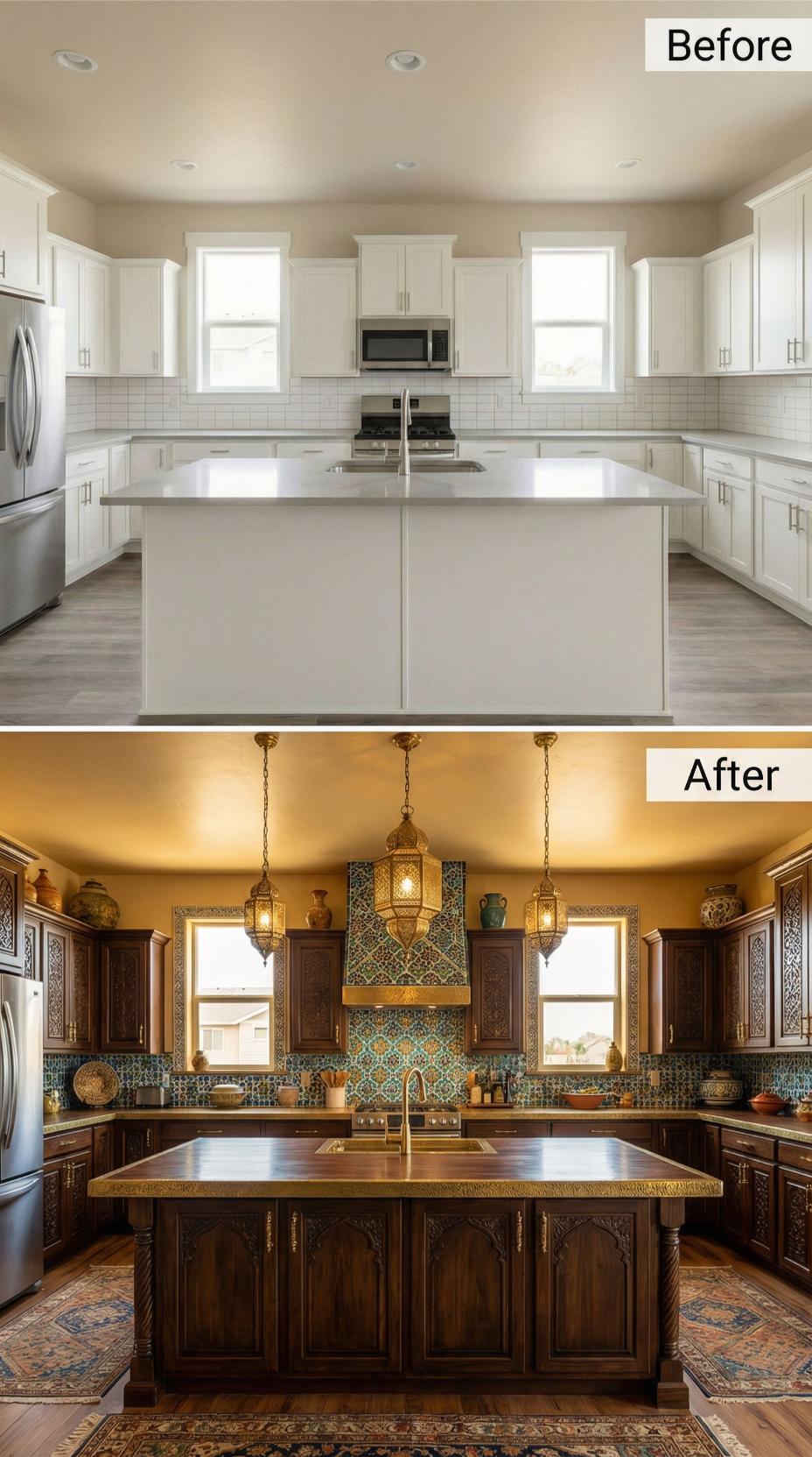 Builder-grade kitchen backsplash gave way to stunning turquoise and gold geometric mosaic tiles that transform the entire space. Rich walnut cabinetry replaced basic white units, while ornate brass lantern pendants create dramatic focal points above the island. Warm copper countertops and decorative pottery complete this luxurious Mediterranean-style transformation that elevates everyday cooking into an exotic culinary experience.