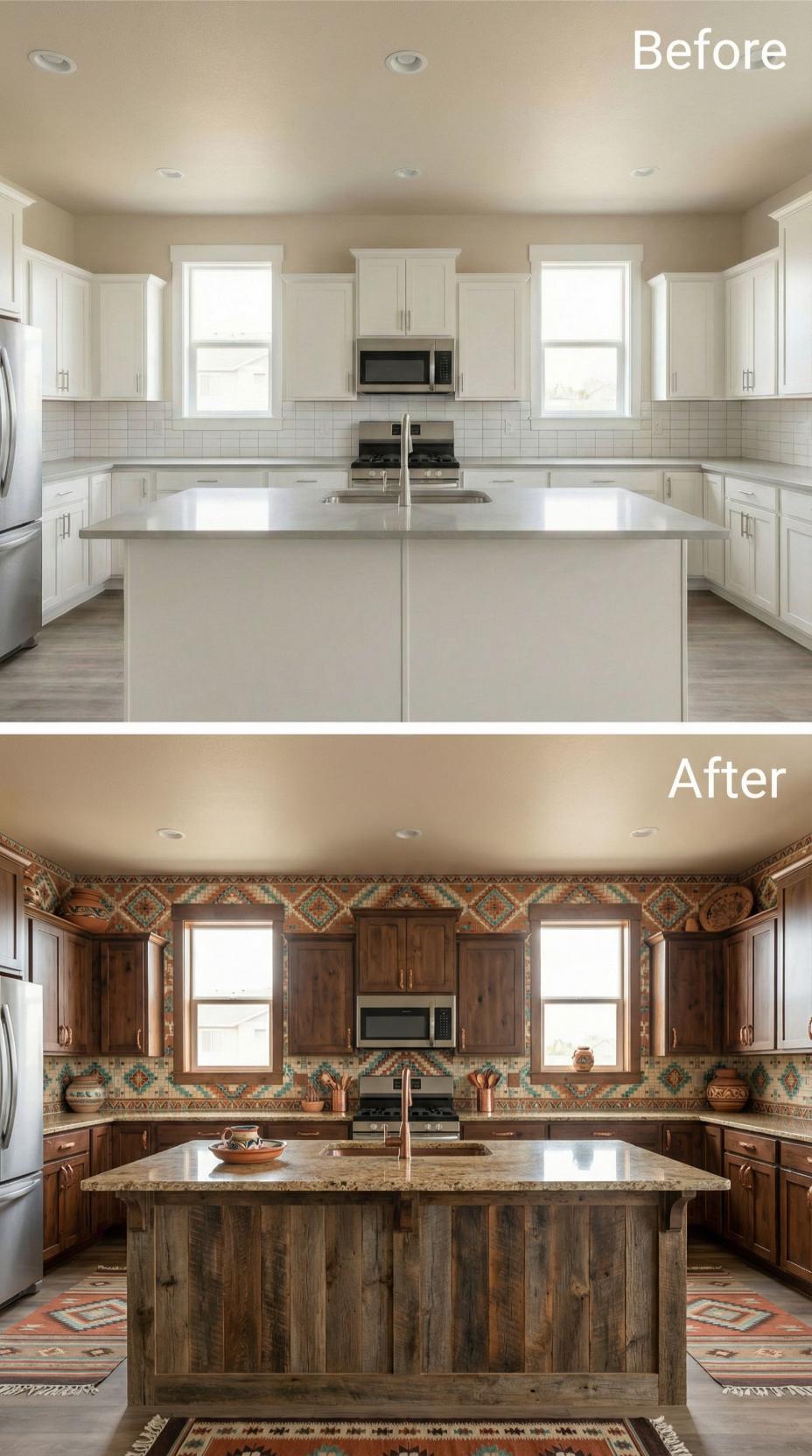 Builder-grade kitchen backsplash gets completely reimagined with bold geometric tile patterns in rich terracotta, turquoise, and cream tones. Dark walnut cabinetry replaces stark white cupboards, while copper accents and rustic reclaimed wood transform the island base. Warm Southwestern textiles and decorative pottery complete this dramatic cultural makeover that celebrates Native American design traditions.