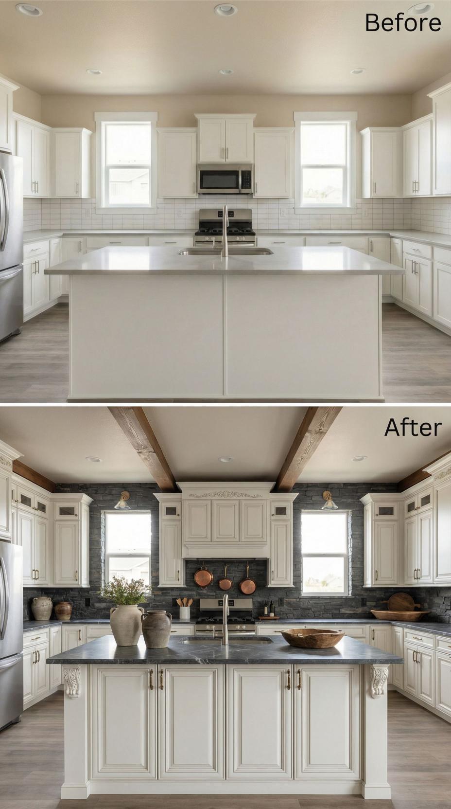Stacked charcoal stone backsplash completely transforms this white kitchen from basic builder-grade subway tile into a stunning focal point. Exposed wooden ceiling beams add rustic warmth while maintaining the clean white cabinetry. Copper pots and ceramic vessels complement the natural stone texture, creating sophisticated farmhouse elegance that elevates the entire space from ordinary to extraordinary.