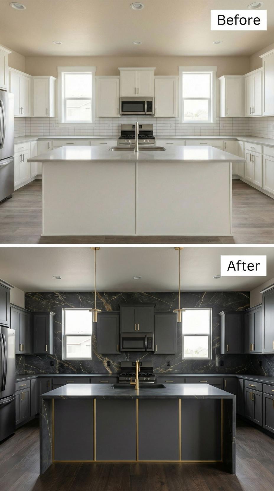 Bold black marble backsplash with gold veining transforms this builder-grade kitchen backsplash into a luxurious focal point. Charcoal gray cabinets complement the dramatic stone while brass hardware and pendant lighting add warmth. White countertops provide striking contrast against the moody palette, creating sophisticated depth throughout the space.